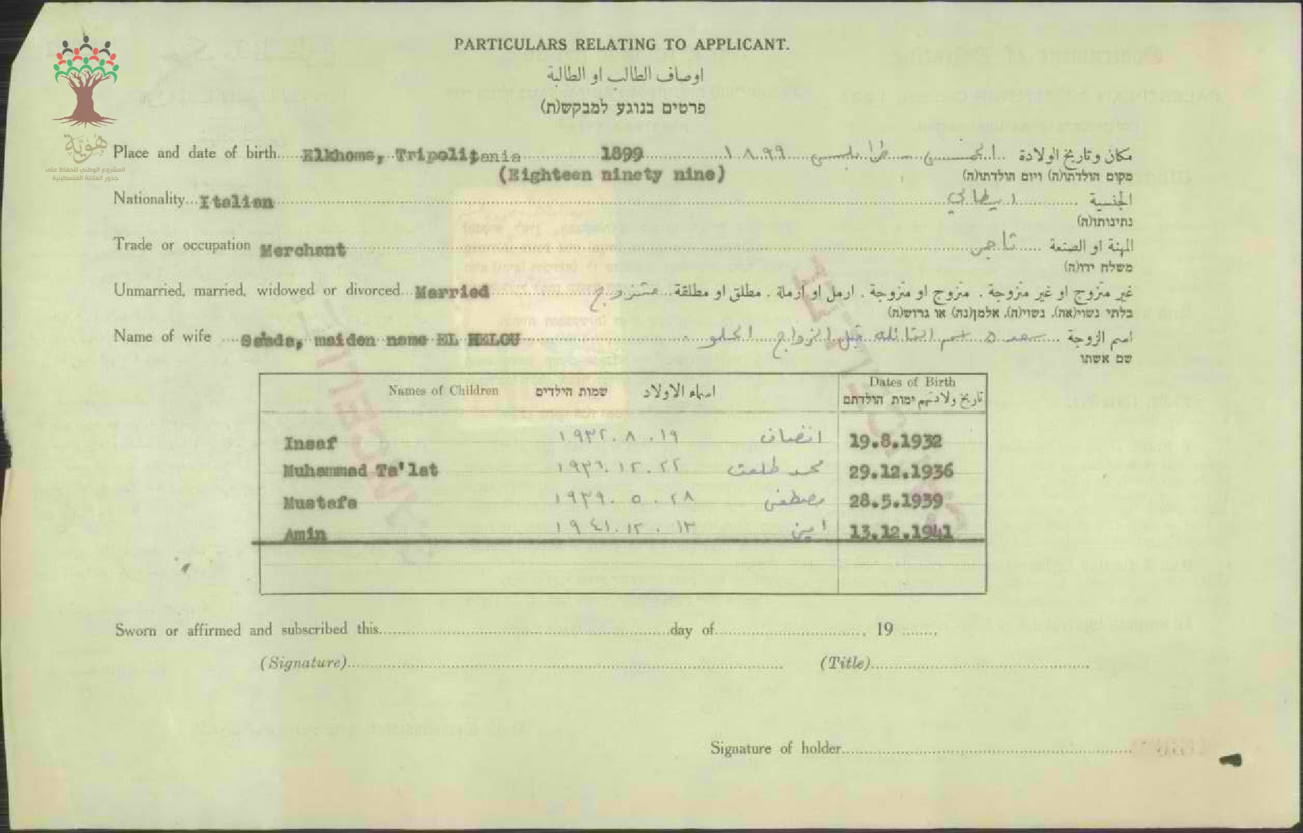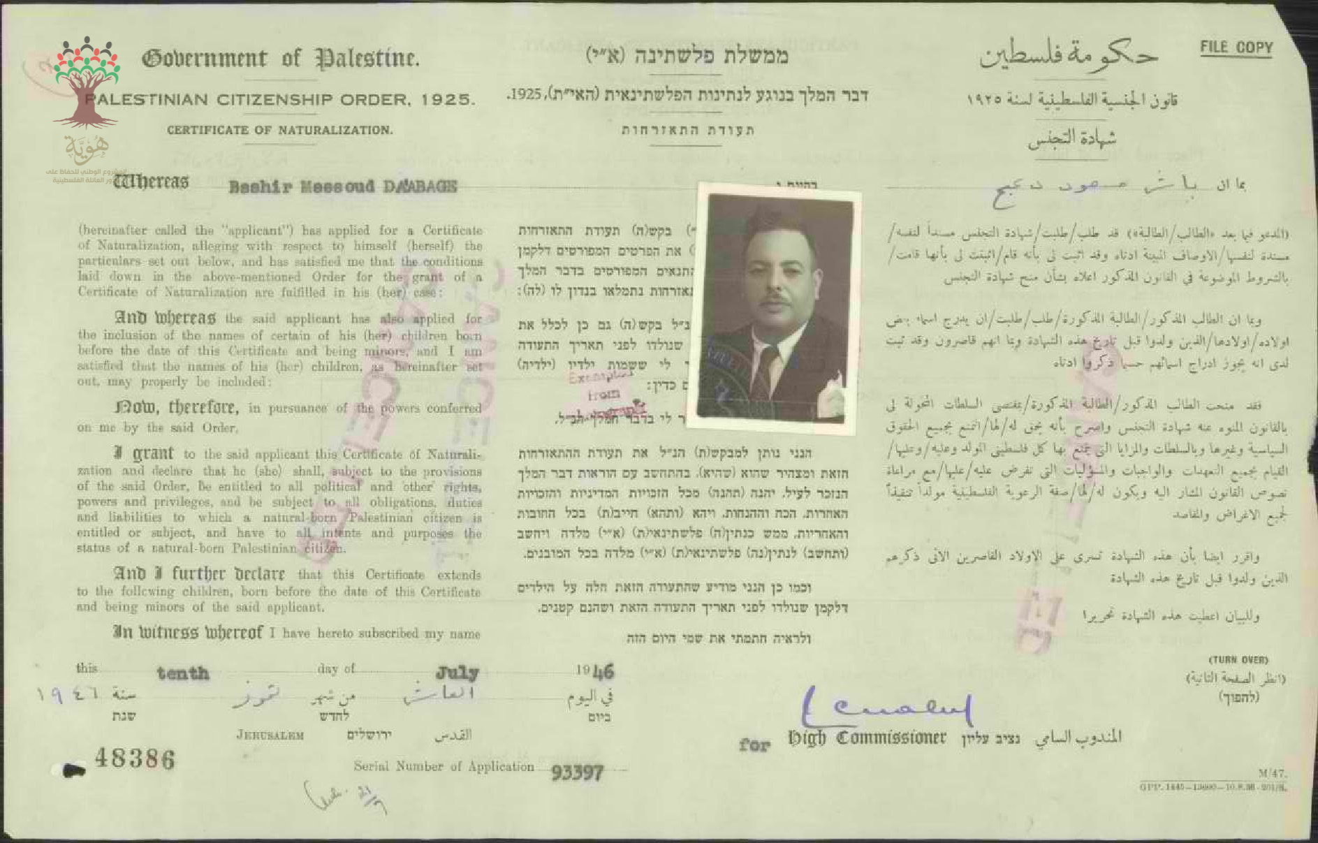 شهادة الجنسية الفلسطينية ل بشير دعبج