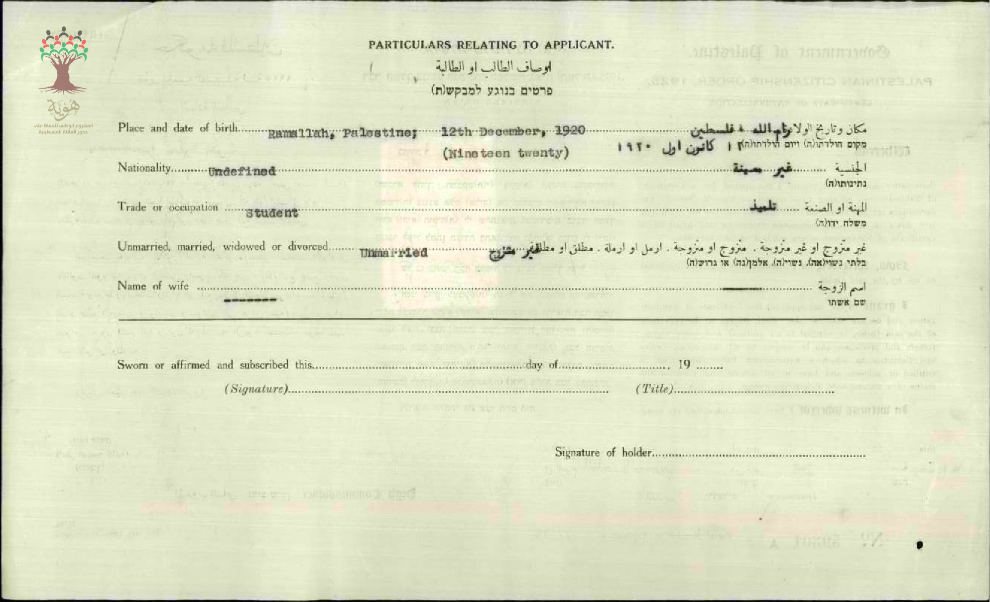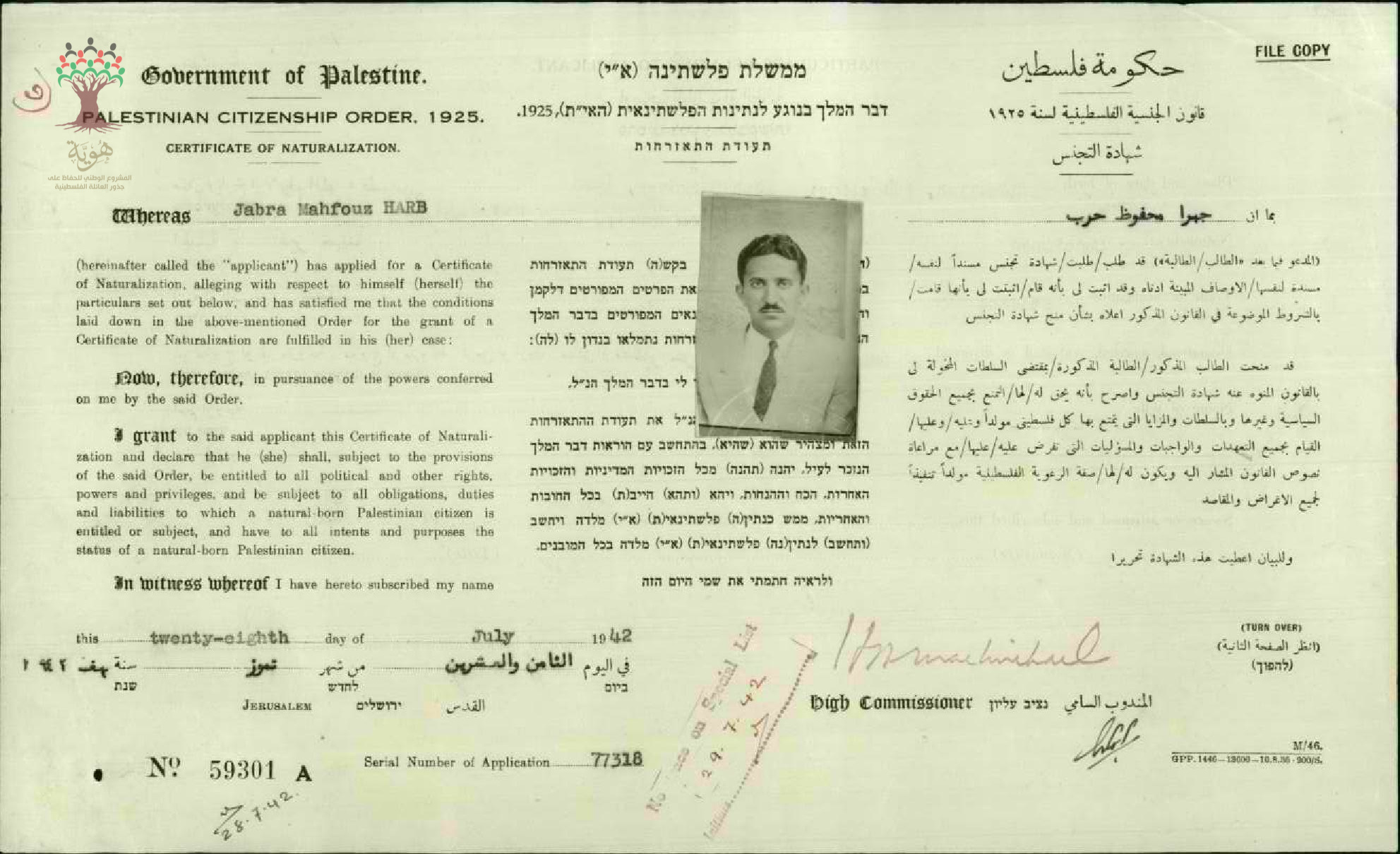 شهادة الجنسية الفلسطينية ل جبرا حرب