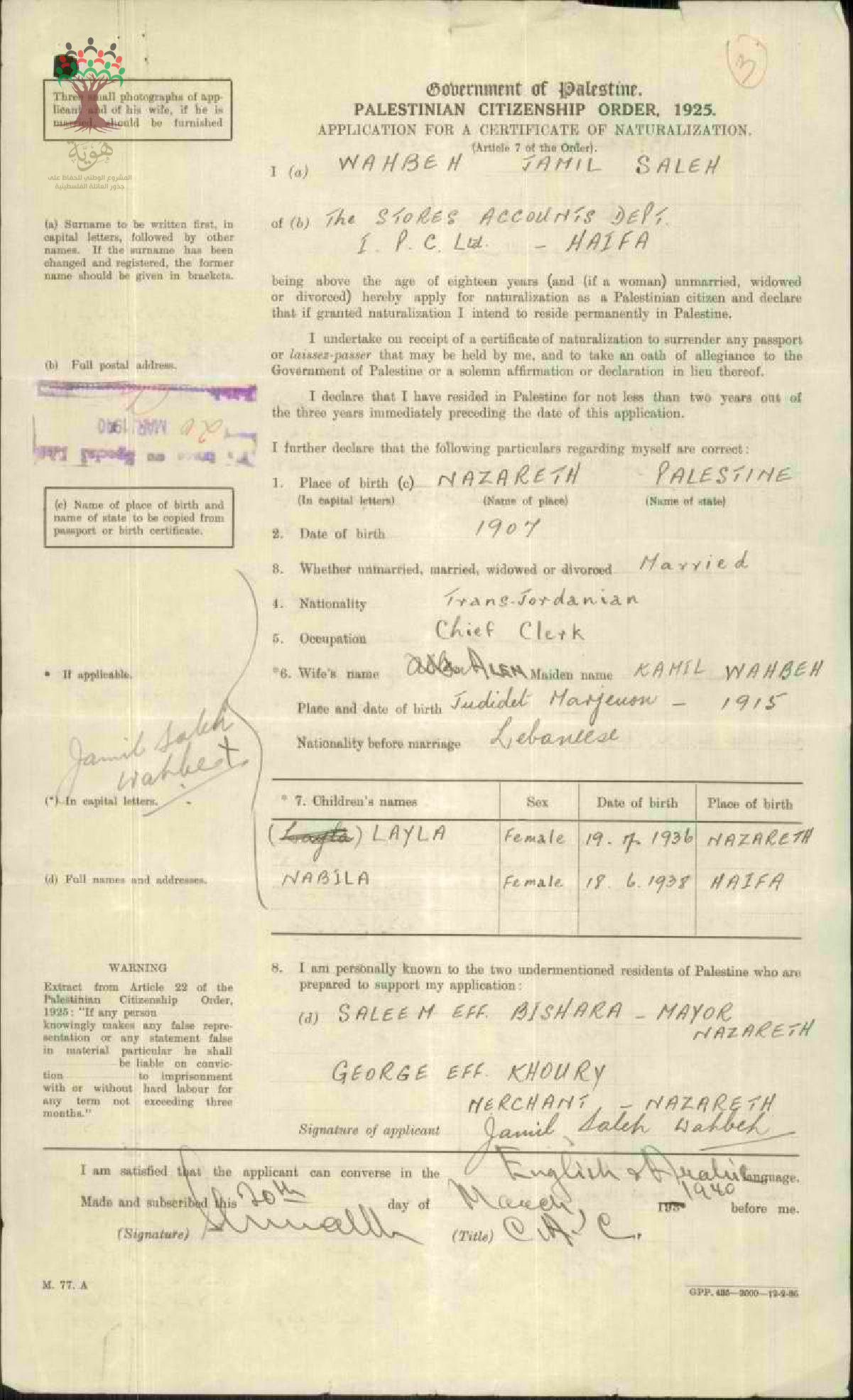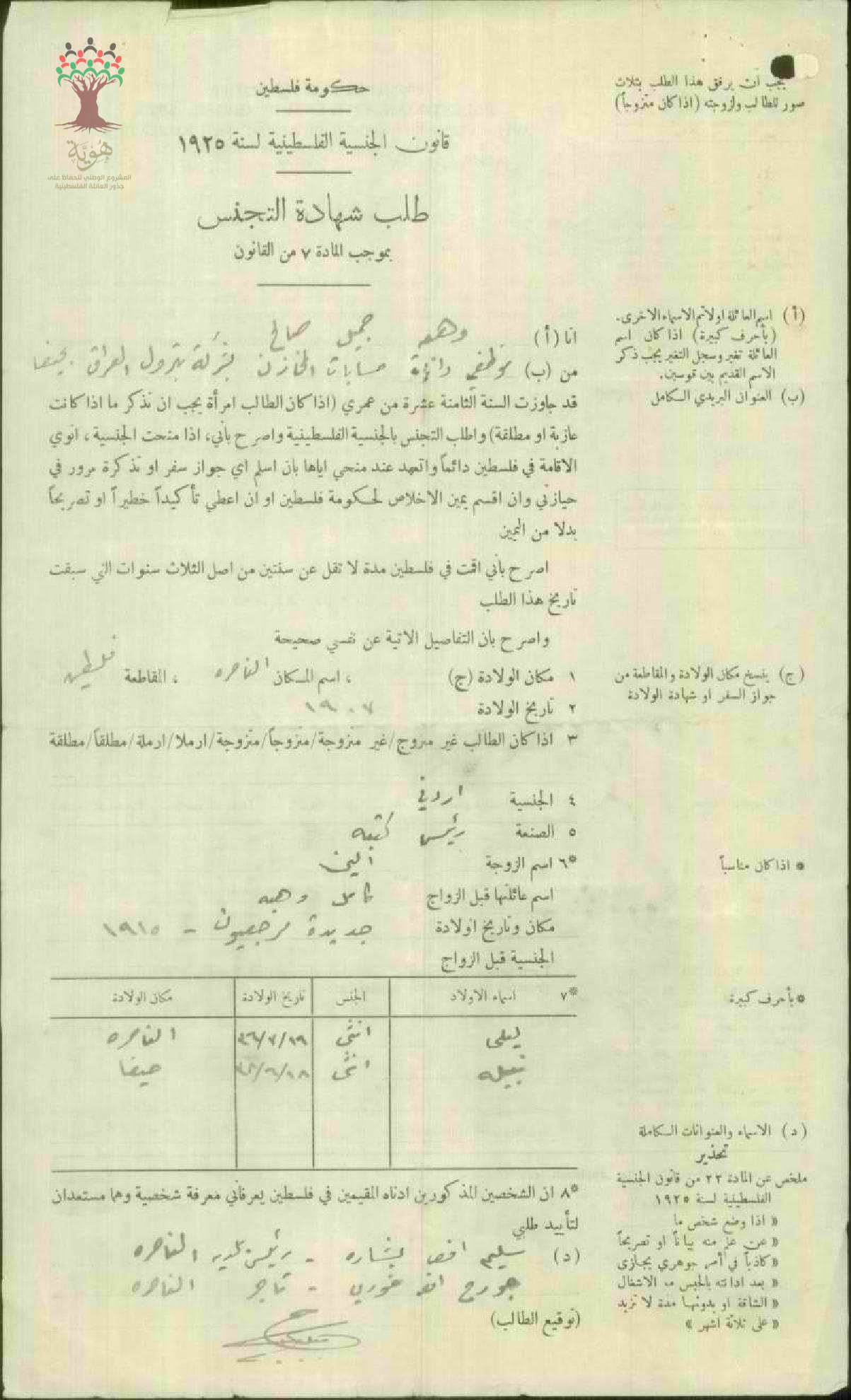 طلب الجنسية الفلسطينية-جميل صالح زيدان-الناصرة/الأردن
