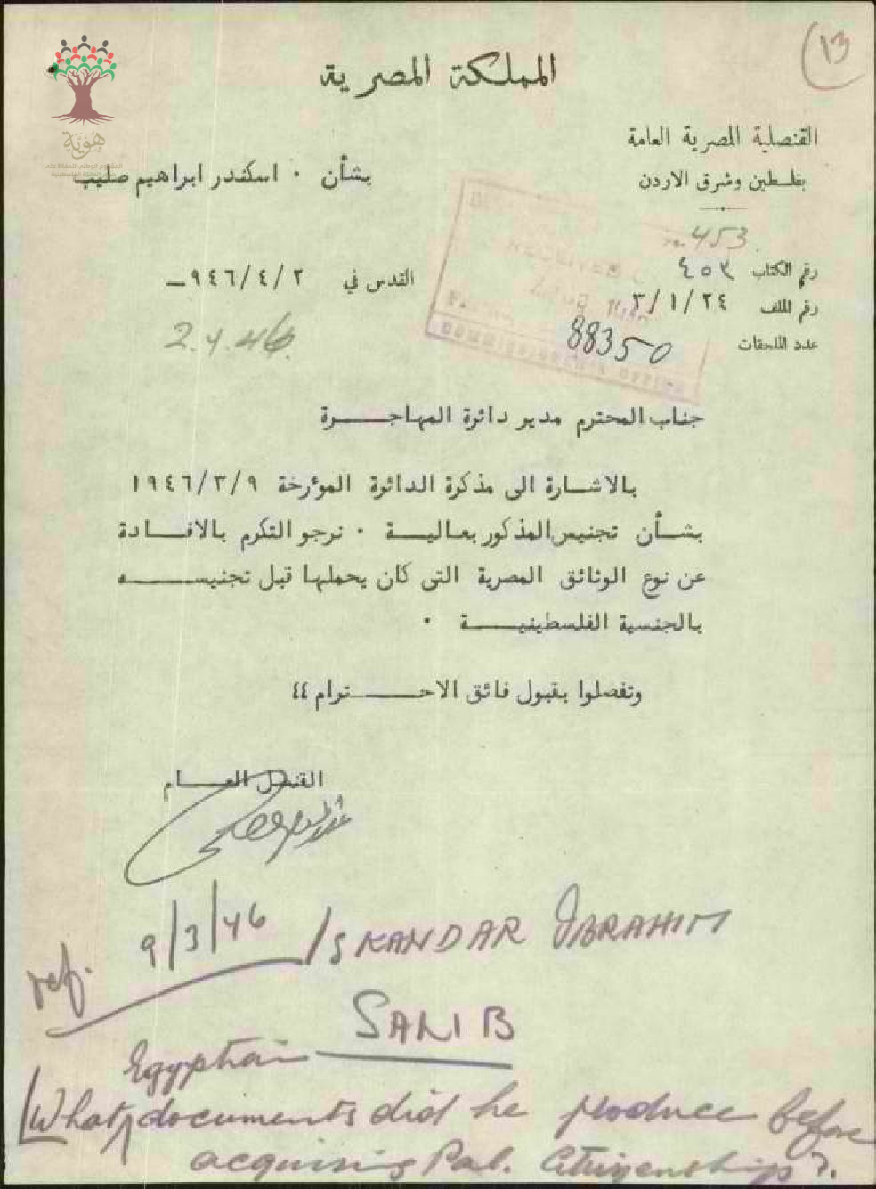 رسالة من القنصلية المصرية بفلسطين إلى مدير دائرة المهاجرة بخصوص طلب الجنسية الفلسطينية للسيد اسكندر صليب