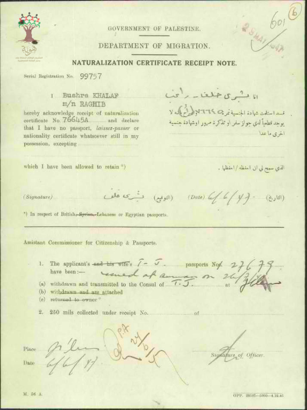 ايصال موقع من بشرى خلف(راغب)باستلام شهادة الجنسية الفلسطينية
