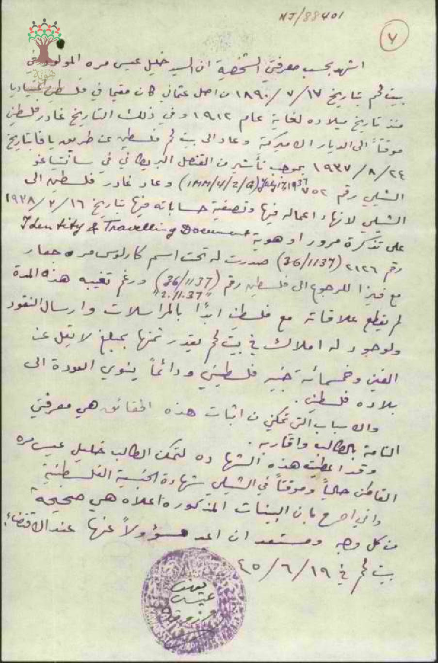 شهادة من المختار يوسف عيسى مرزوق للسيد خليل عيسى مرة بخصوص طلب الجنسية/بيت لحم