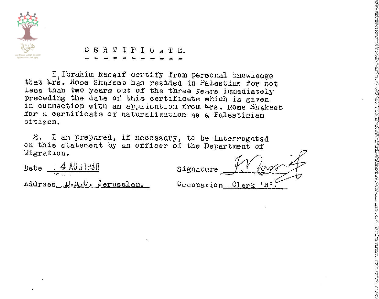 شهادة من السيد إبراهيم ناصيف للسيدة روز شكيب بخصوص طلب الجنسية/القدس