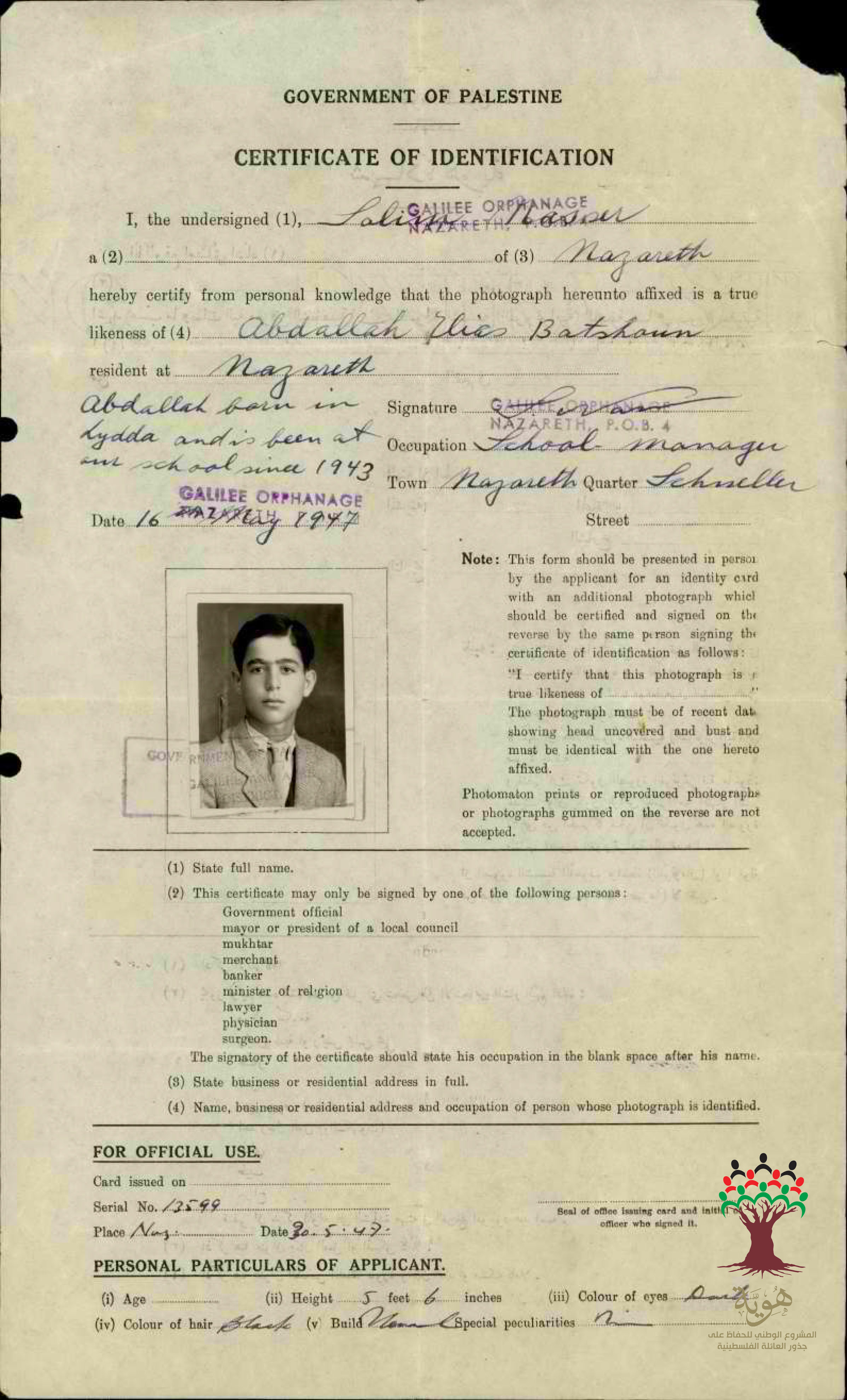 شهادة هوية عبدالله بطشون - مواليد اللد وسكان الناصرة