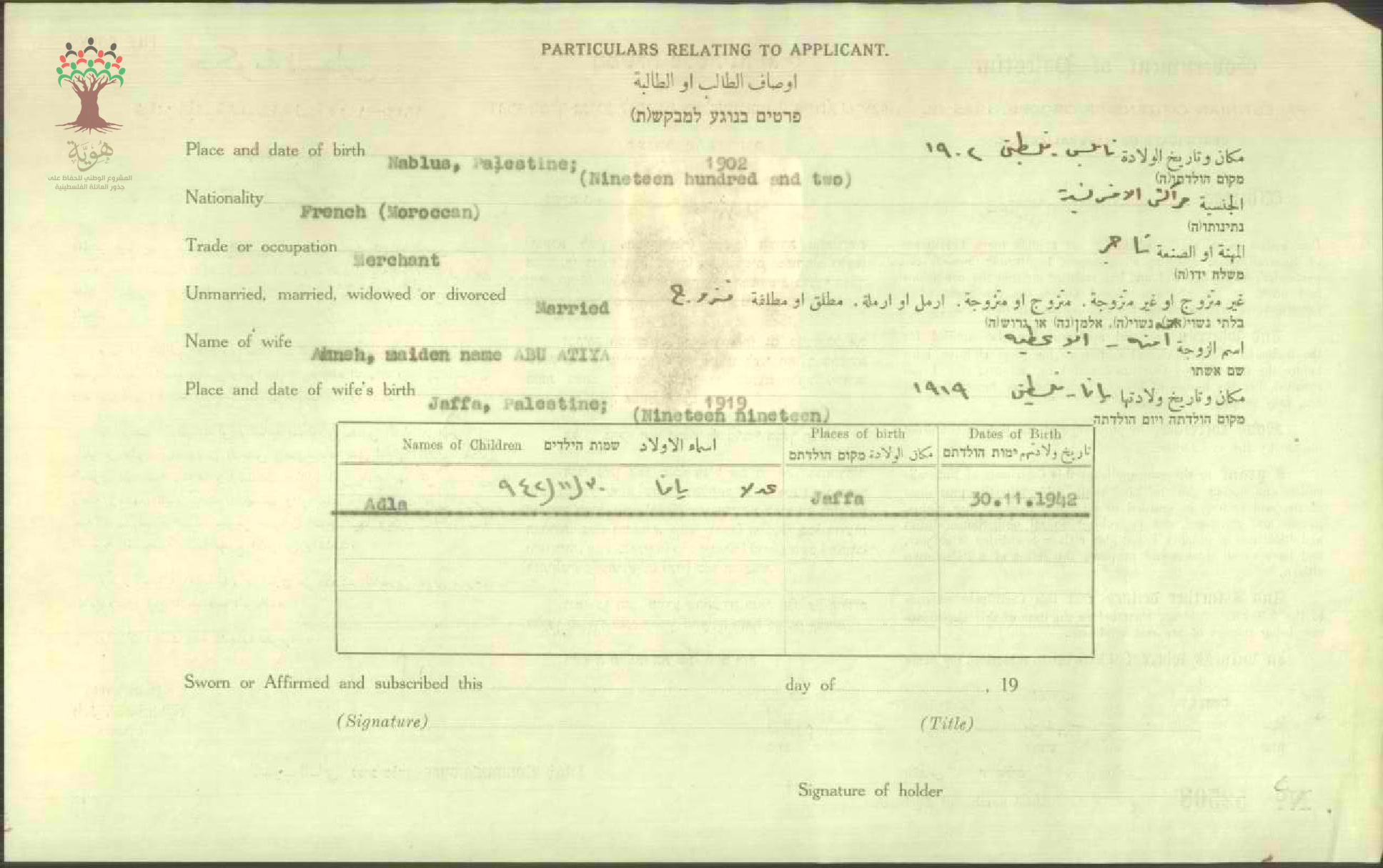 شهادة الجنسية الفلسطينية ل شكري دمناتي
