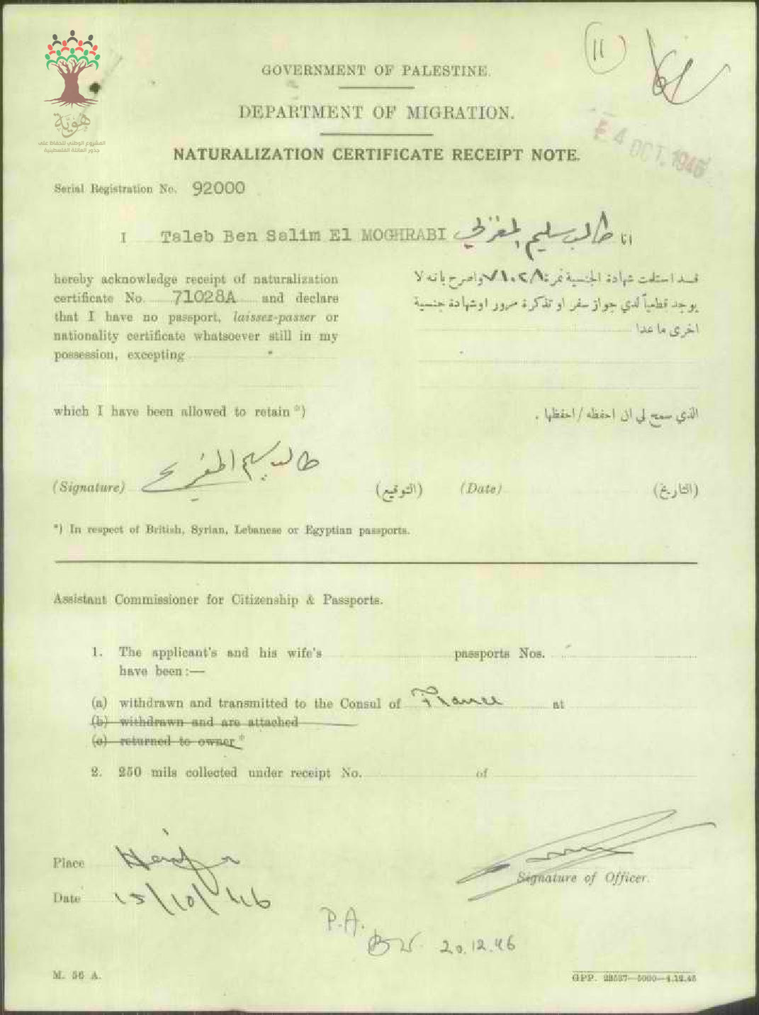 إيصال موقع من طالب سليم المغربي باستلام شهادة الجنسية الفلسطينية