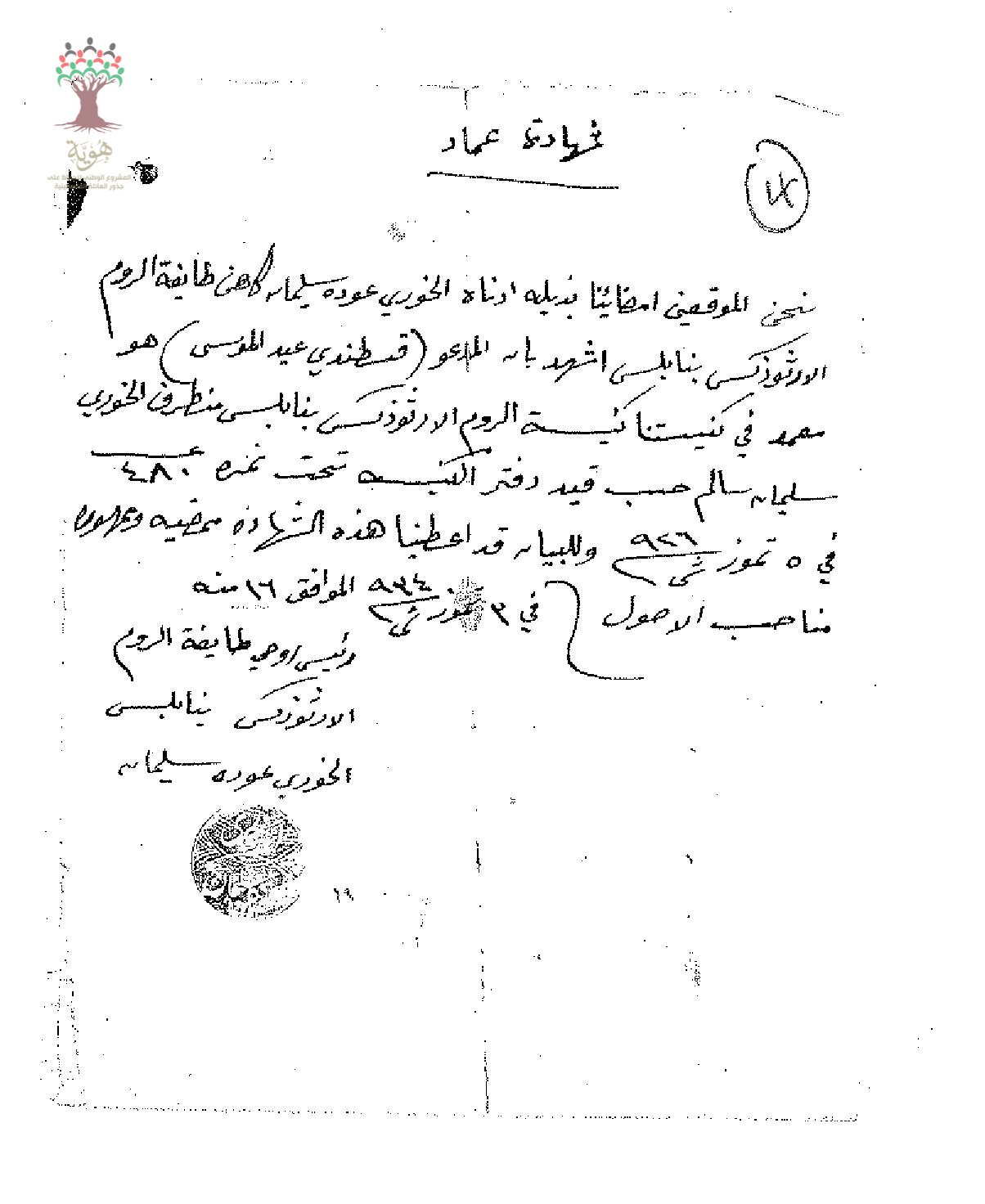 شهادة عماد من الخوري عودة سليمان ل قسطندي عيد سليمان ابن رسمية حنا عودة