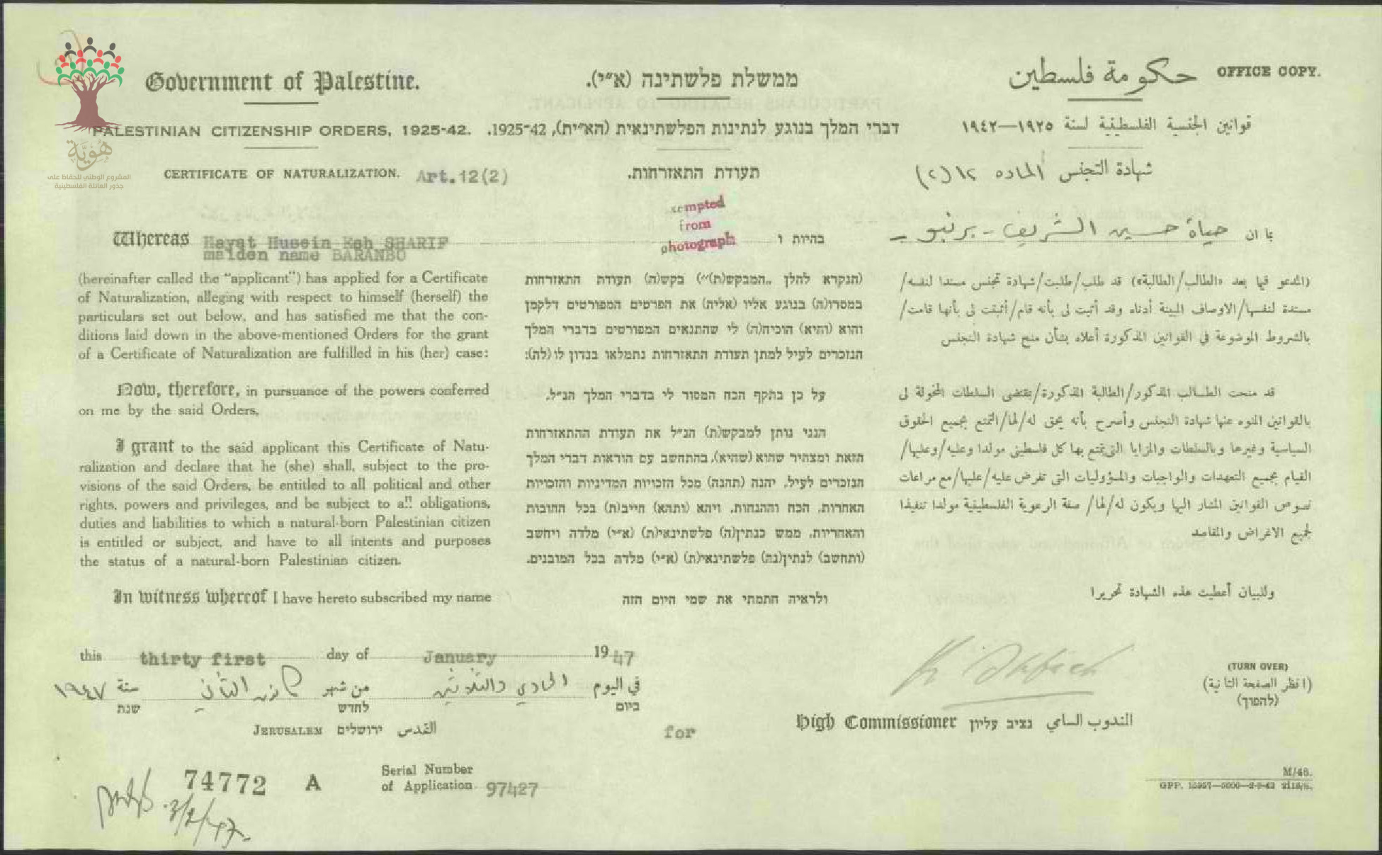 شهادة الجنسية الفلسطينية -حياة حسين الشريف(برنبو)