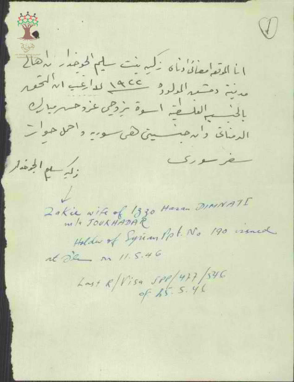 رسالة من زكية سليم الجوخدار زوجة عزو الدمناتي بخصوص طلب الجنسية الفلسطينية