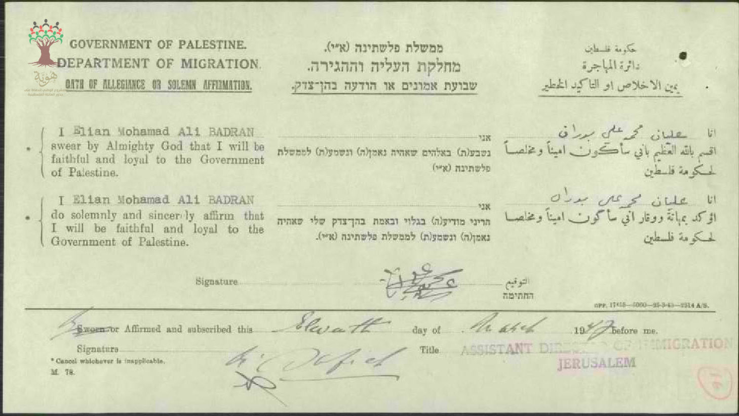 عليان بدران يوقع على (يمين الإخلاص) للحصول على الجنسية الفلسطينية