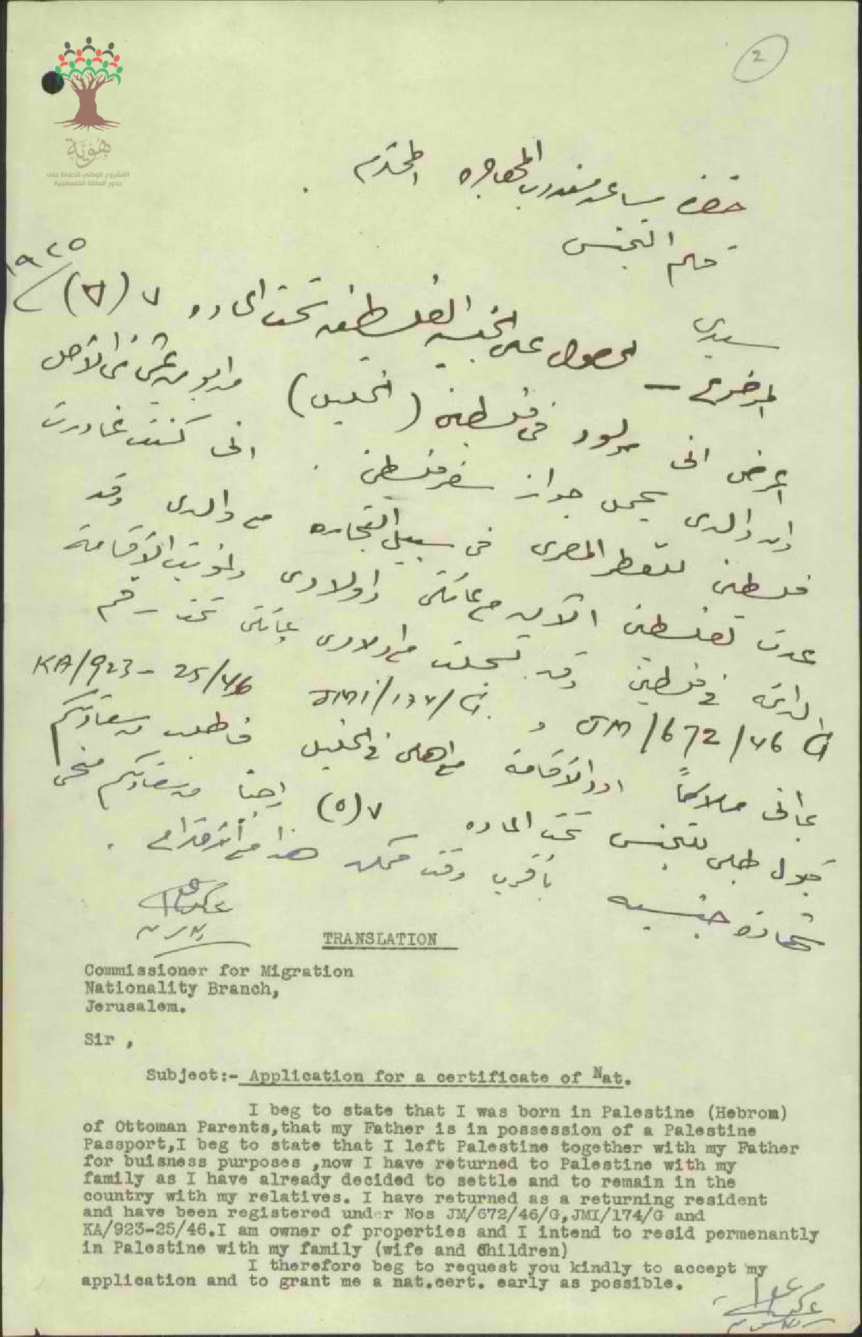 رسالة من عليان بدران الى مدير دائرة المهاجرة بخصوص طلب الجنسية الفلسطينية