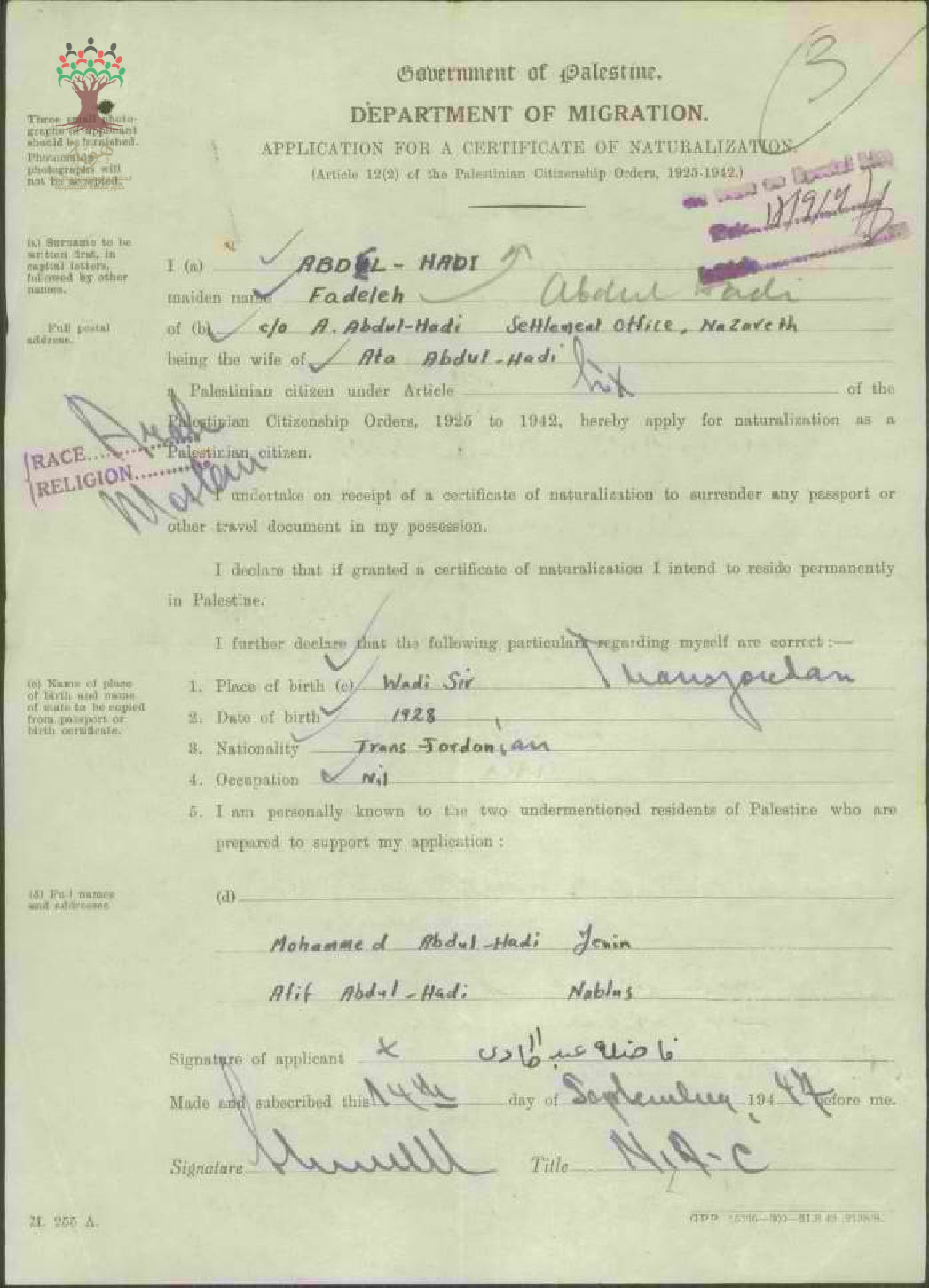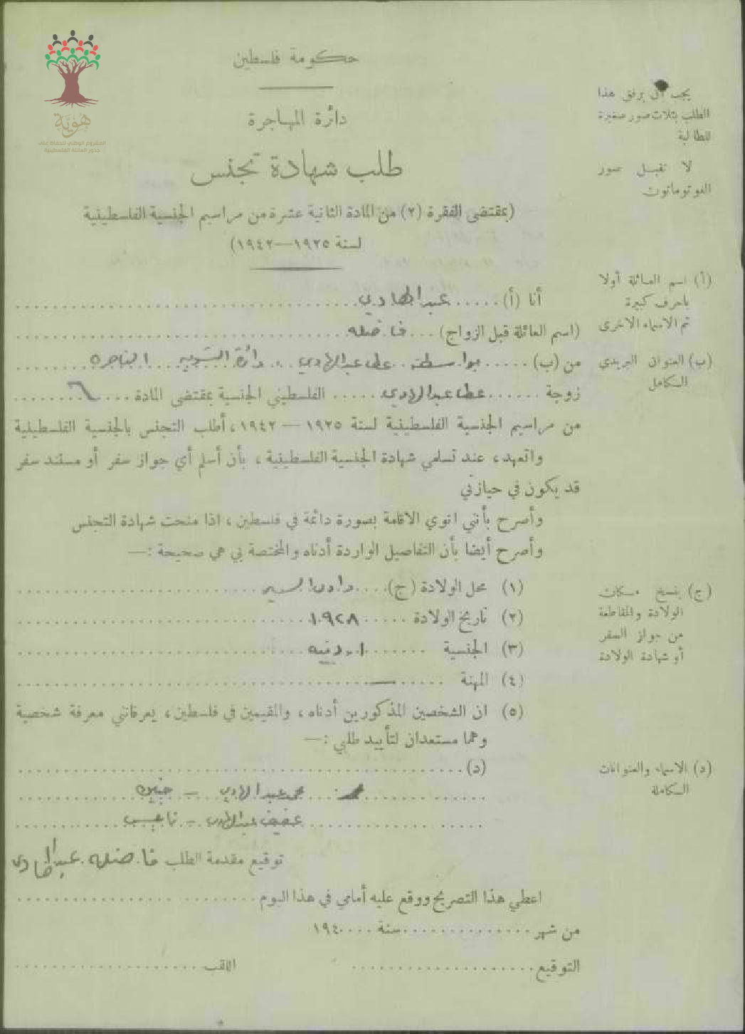 طلب الجنسية الفلسطينية-فاضلة عبد الهادي-نابلس