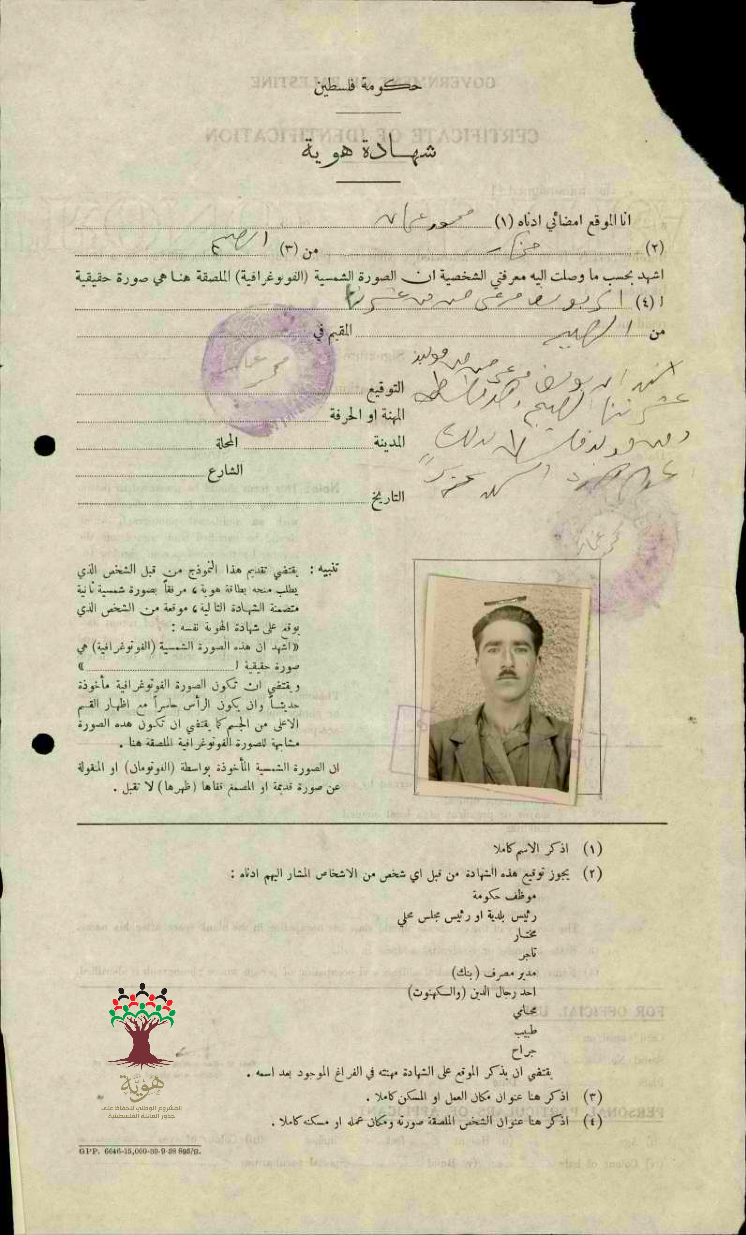 شهادة هوية يوسف مرعي حسن من عشيرة الصبيح - بتوقيع المختار محمود عثمان 1947