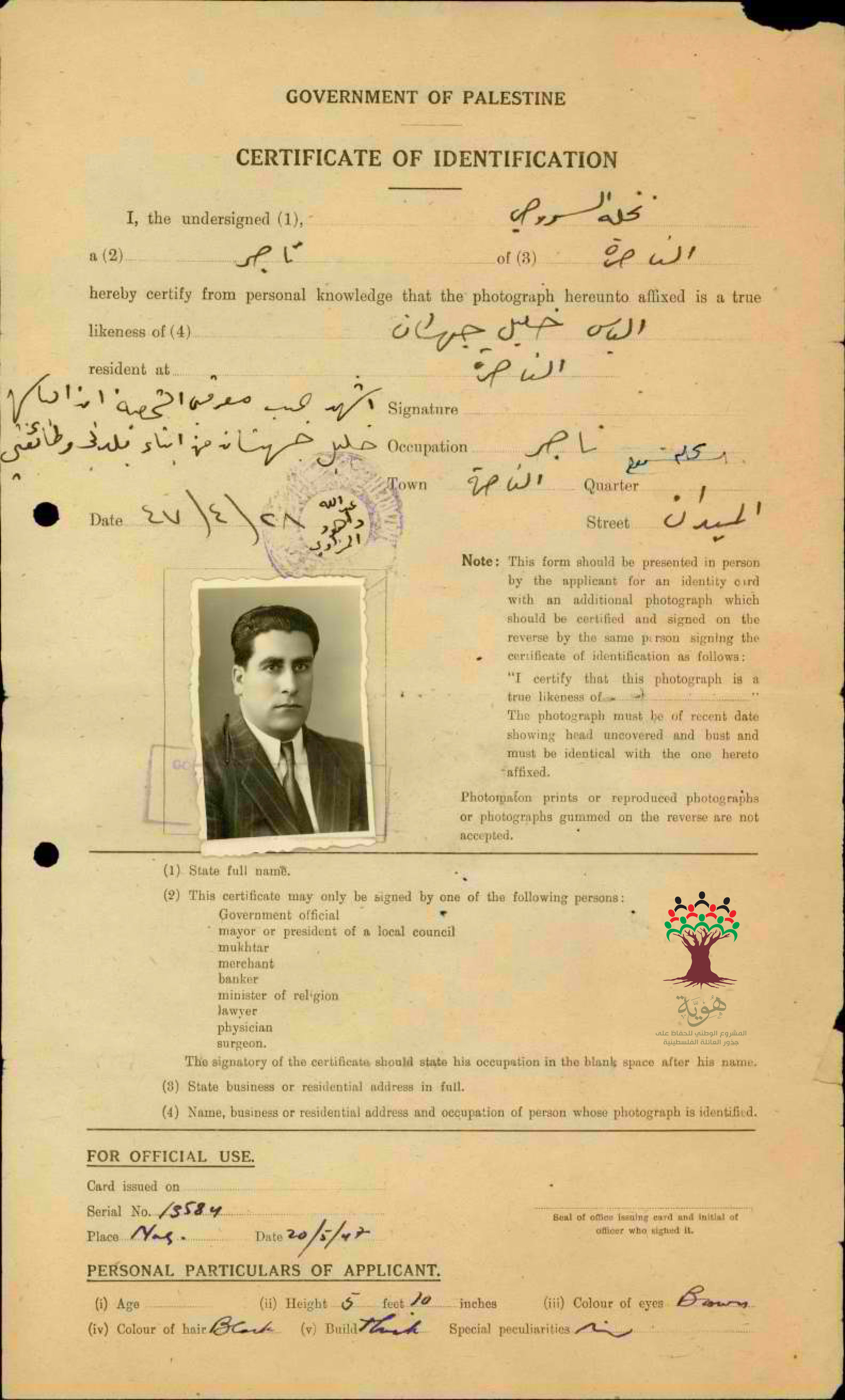 شهادة هوية الياس خليل جهشان - الناصرة بتوقيع المختار نخلة السروجي عام 1947