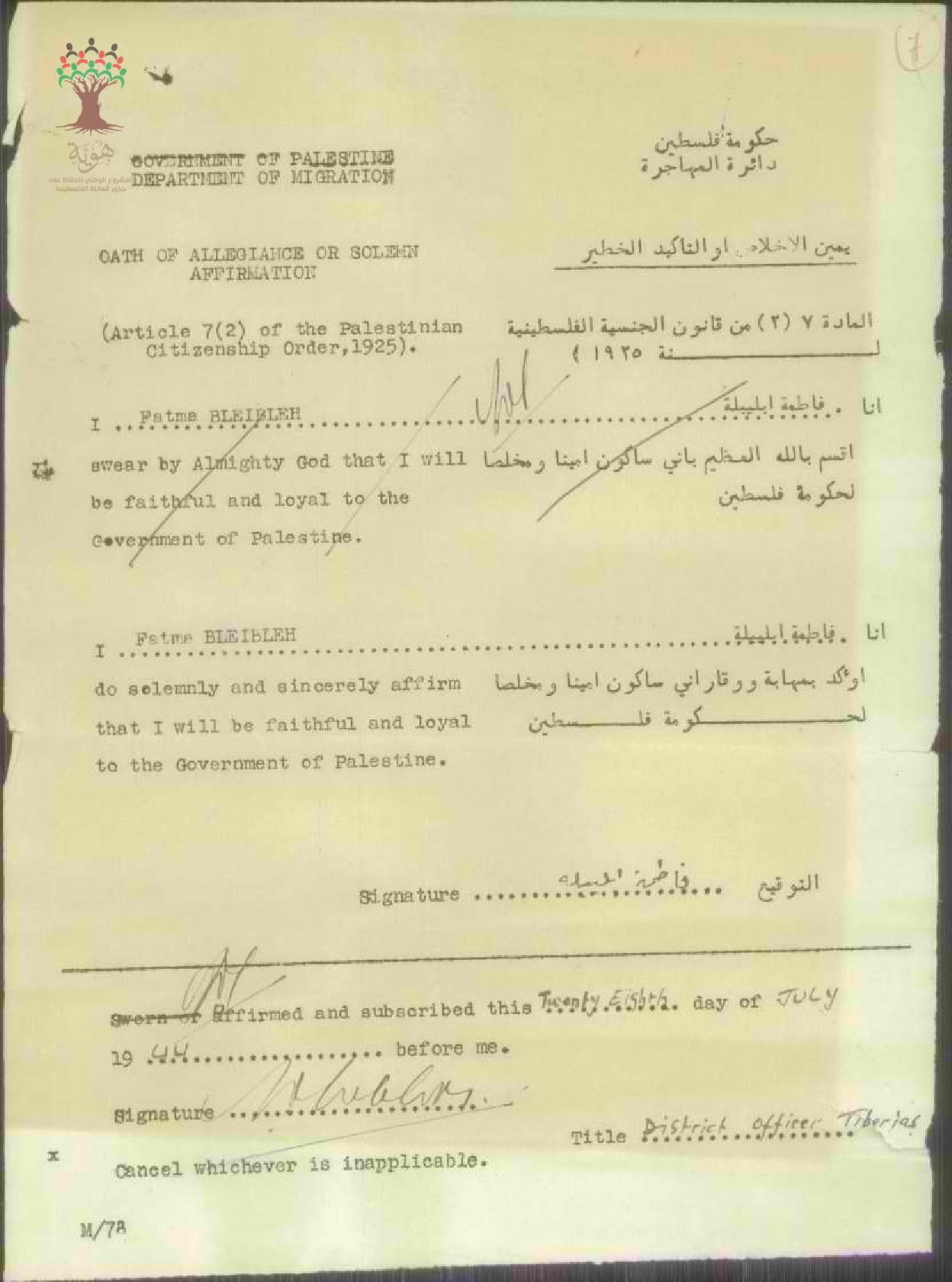 فاطمة الشماع ابليبلة توقع على (يمين الإخلاص) للحصول على الجنسية الفلسطينية