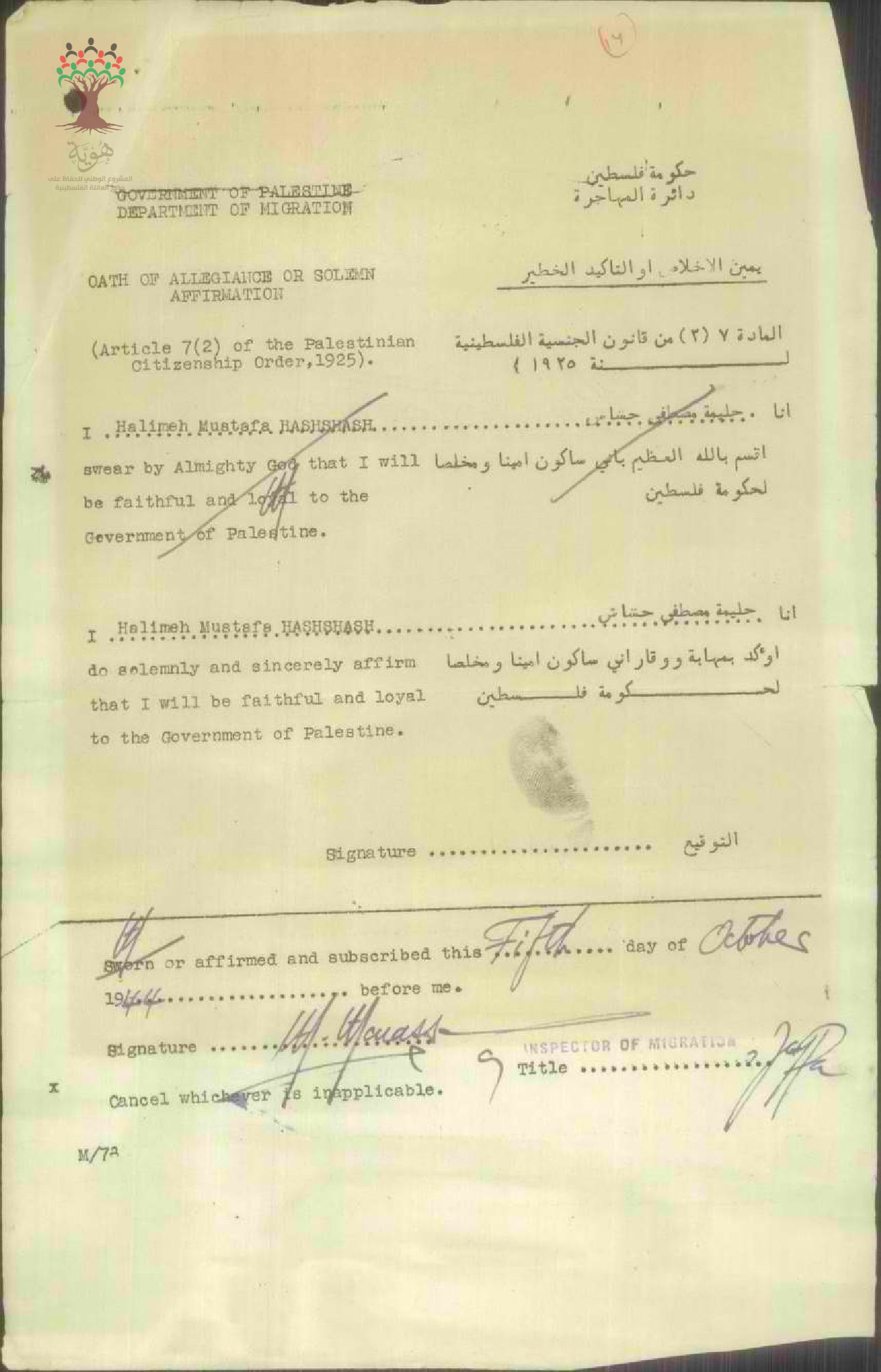 حليمة مصطفى حشاش(الهندي)توقع على(يمين الاخلاص)للحصول على الجنسية الفلسطينية