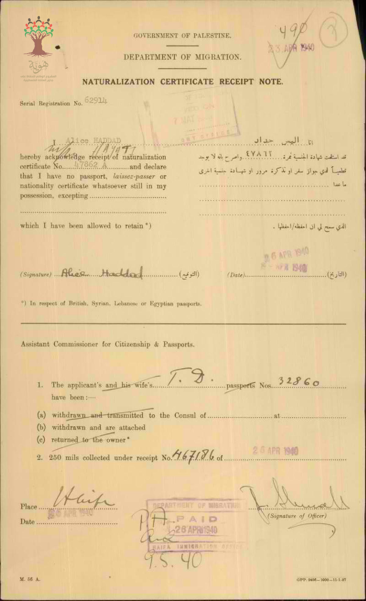 إيصال موقع من أليس حداد باستلام شهادة الجنسية الفلسطينية