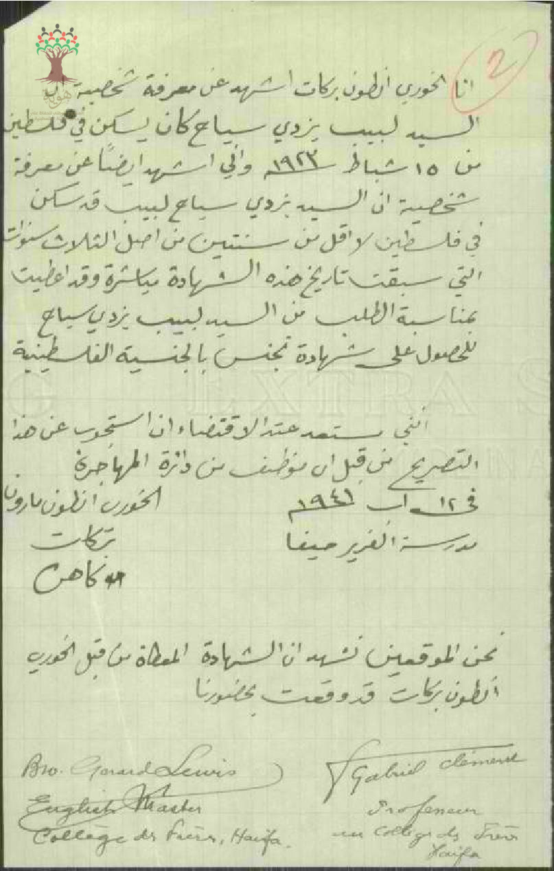 شهادة من الخوري للسيد لبيب يزدي سياح بخصوص طلب الجنسية/حيفا