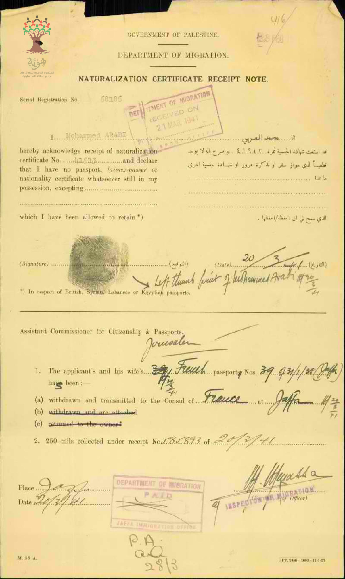 إيصال موقع من محمد العربي باستلام شهادة الجنسية الفلسطينية