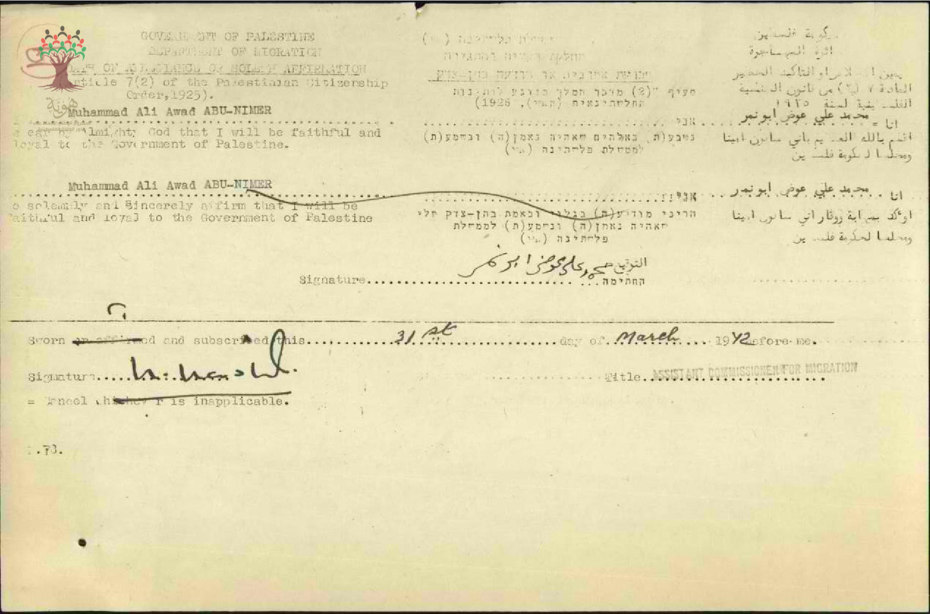 محمد علي عوض أبو نمر يوقع على (يمين الإخلاص) للحصول على الجنسية الفلسطينية