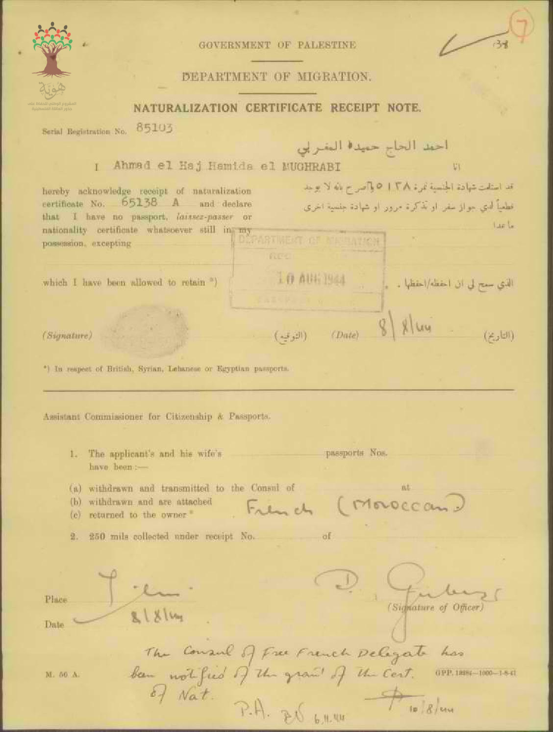 إيصال موقع من أحمد حميدة مغربي باستلام شهادة الجنسية الفلسطينية