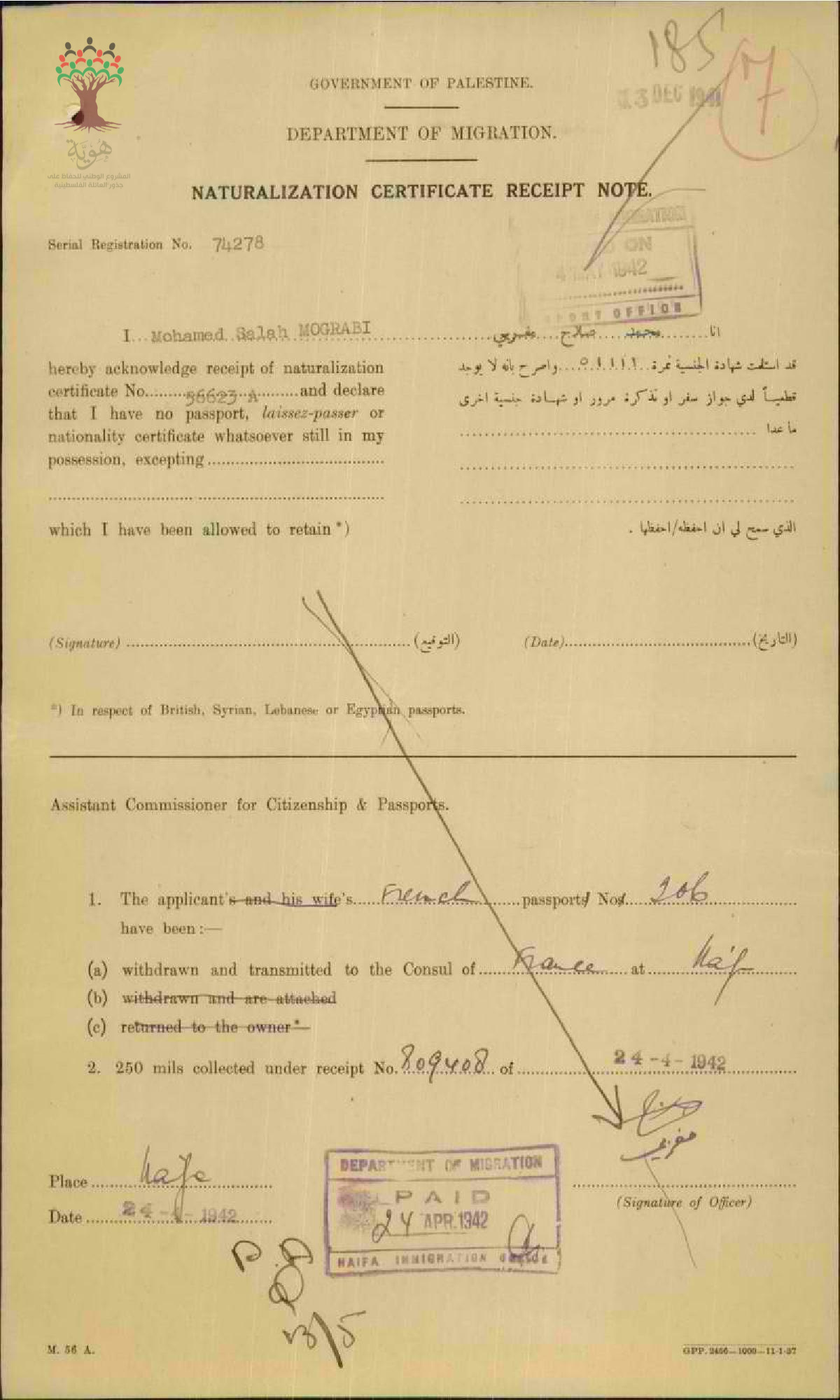 إيصال موقع من محمد صلاح المغربي باستلام شهادة الجنسية الفلسطينية