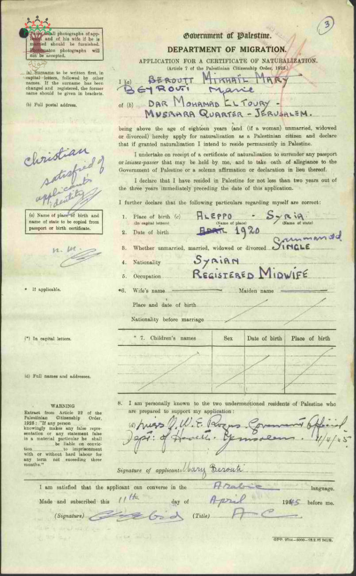 طلب الجنسية الفلسطينية-ماري مخائيل بيروتي/سوريا