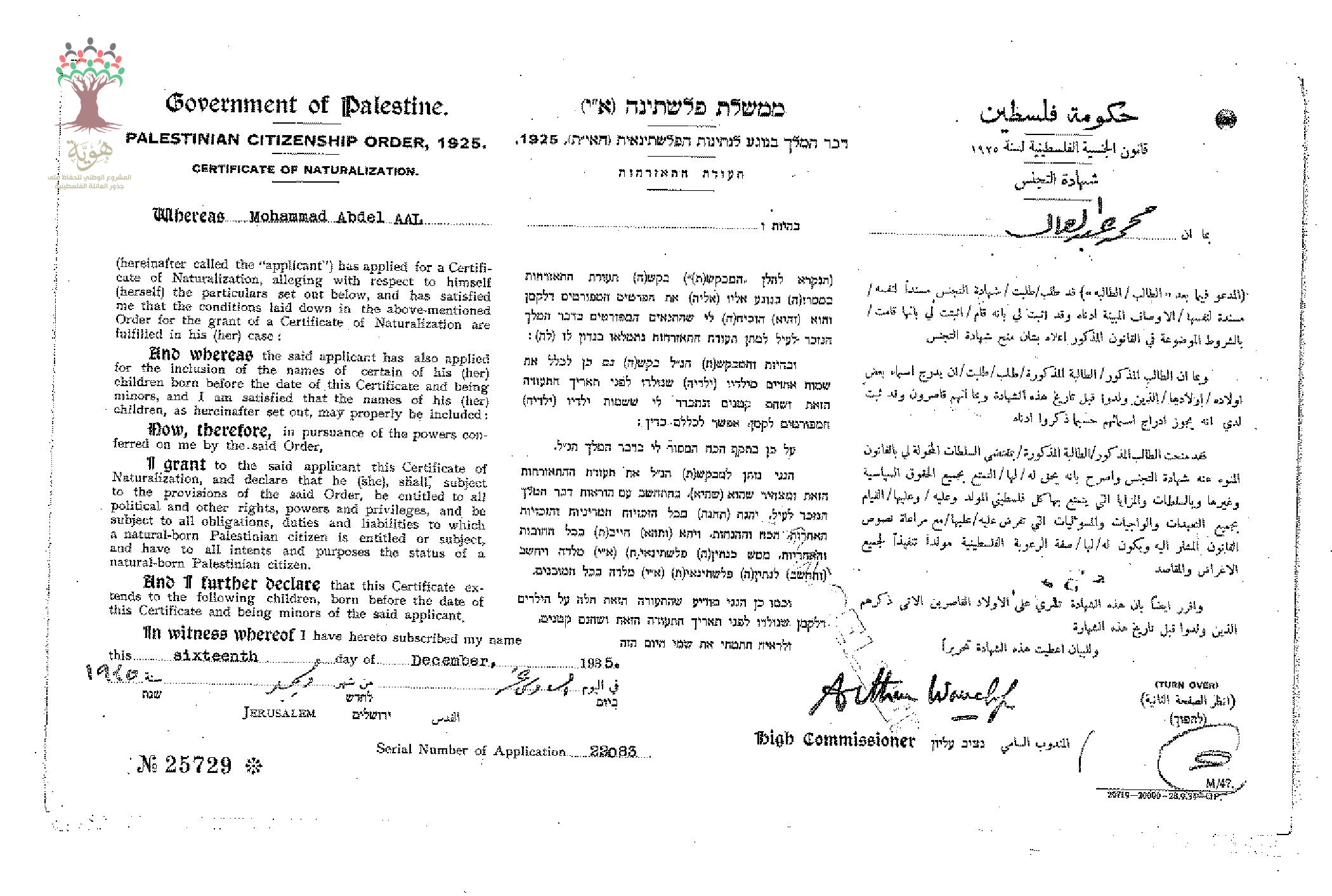 شهادة الجنسية الفلسطينية ل محمد عبد العال