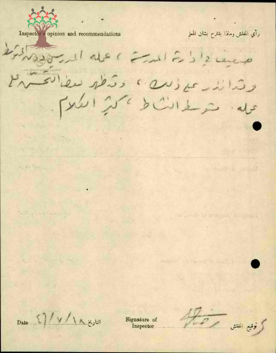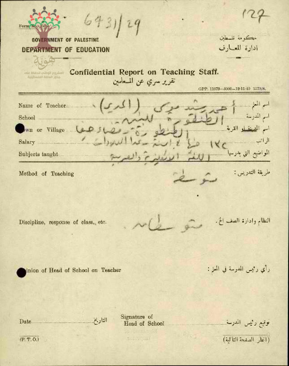 تقرير تفصيلي عن أداء المعلم أحمد رشيد موسى عودة في مدرسة طنطورة