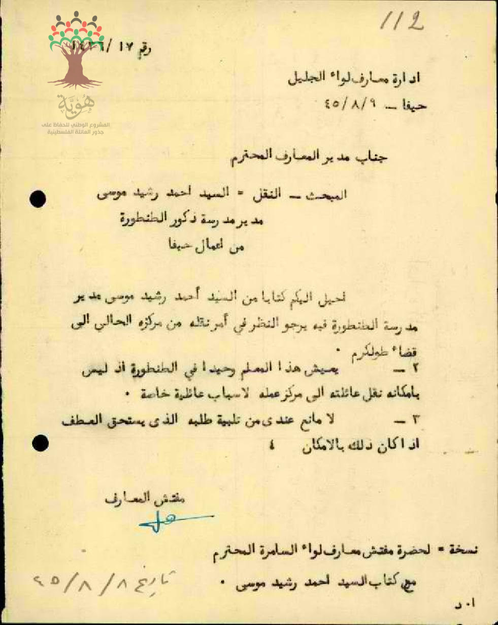 رسالة من مفتش المعارف إلى ادارة المعارف بخصوص نقل المعلم أحمد رشيد موسى عودة من الطنطورة إلى طولكرم