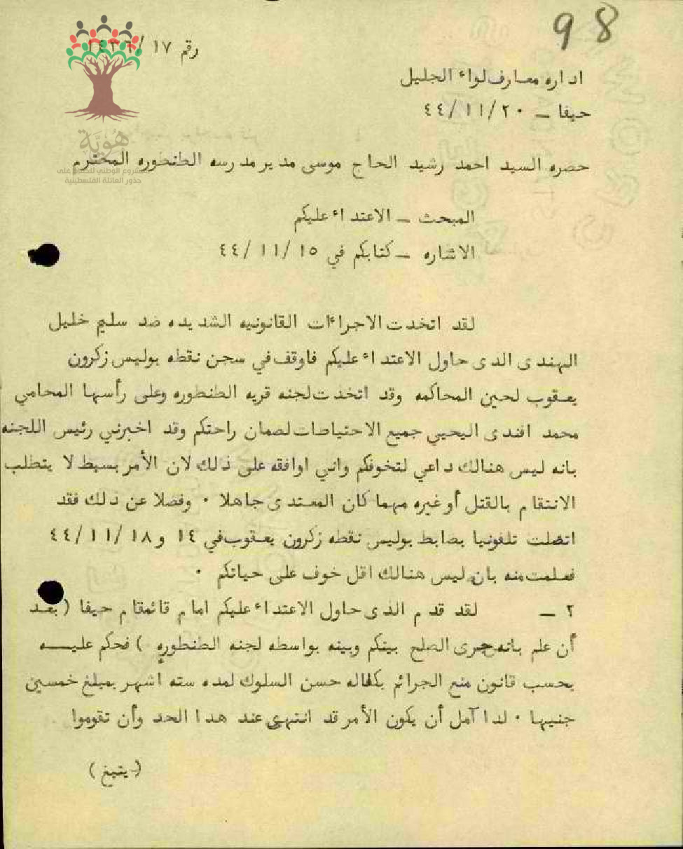 رسالة من ادارة المعارف إلى المعلم أحمد رشيد موسى عودة تبلغه بالاجراءات القانونية التي تم اتخاذها بخصوص الاعتداء عليه