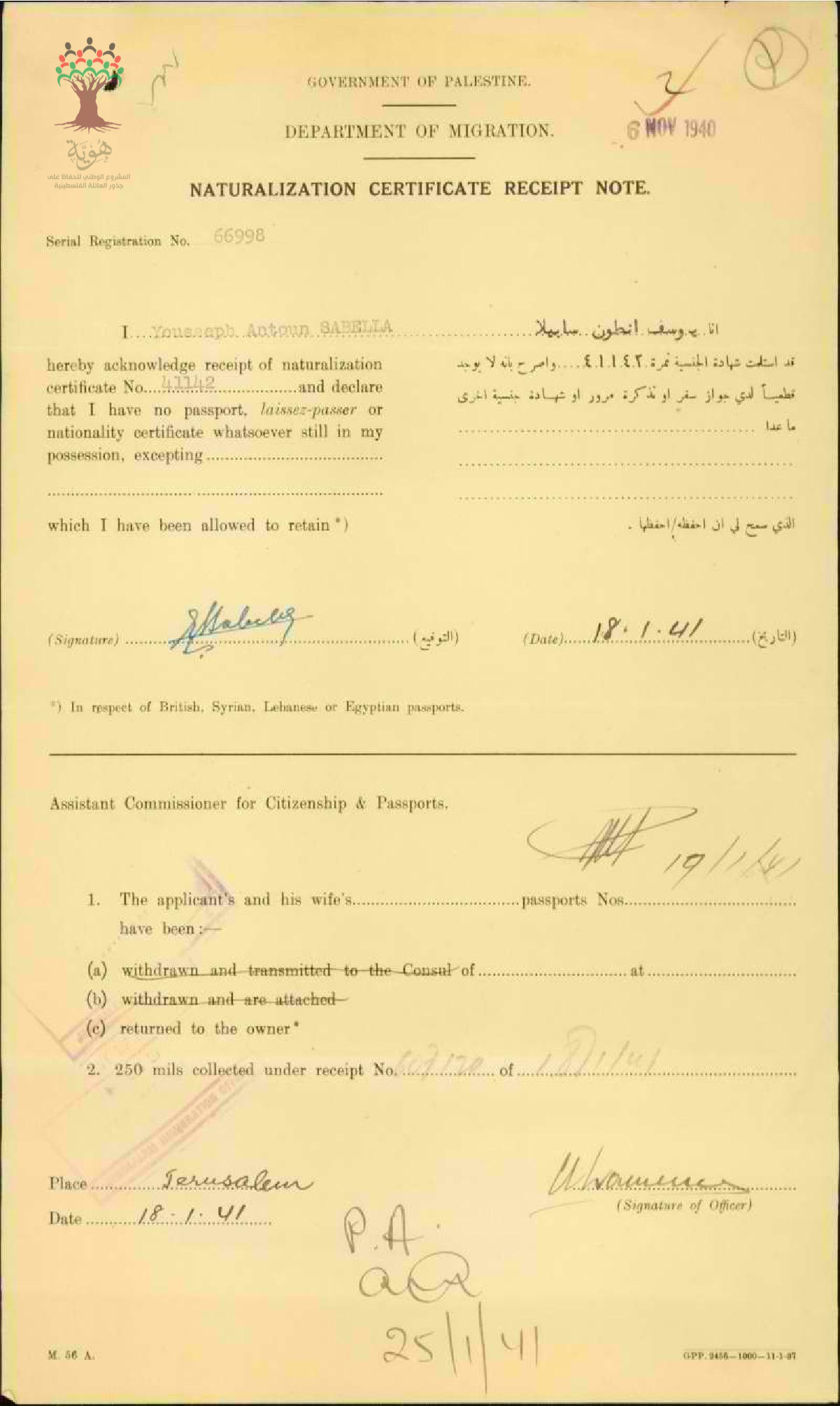 إيصال موقع من يوسف سابيلا باستلام شهادة الجنسية الفلسطينية