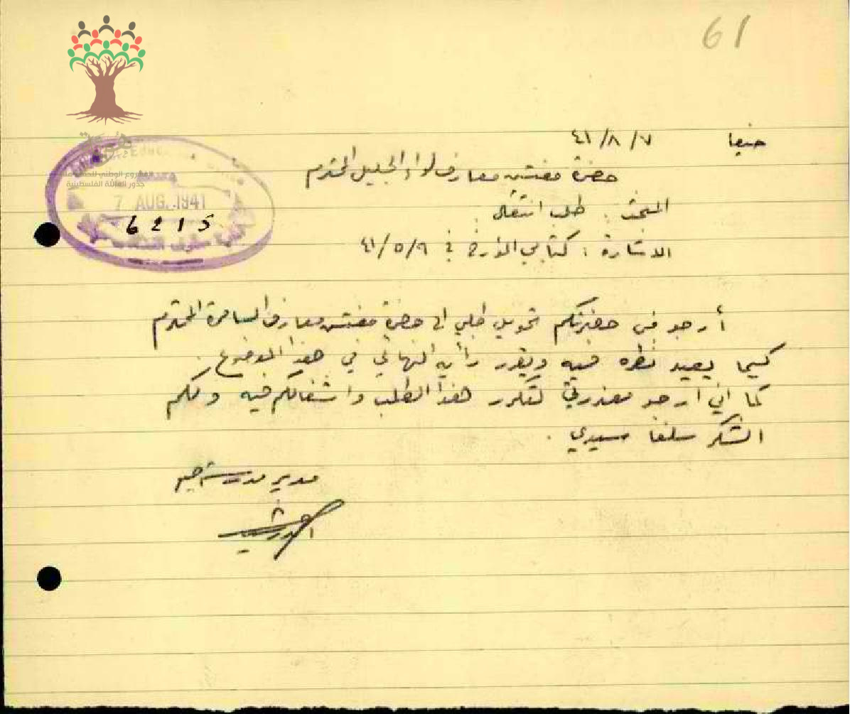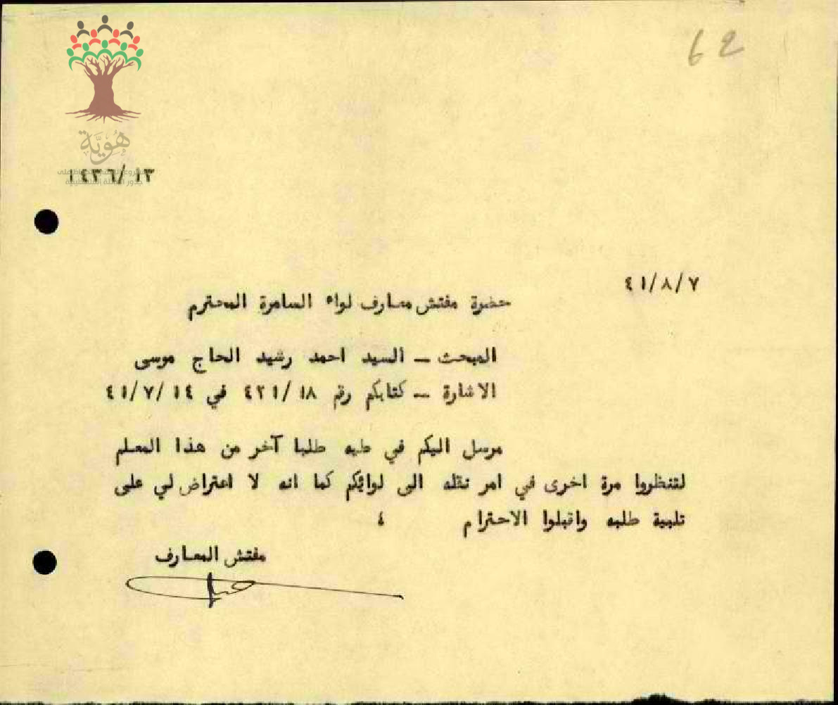 رسالة من مفتش المعارف إلى ادارة المعارف تبحث أمر نقل المعلم أحمد رشيد موسى عودة