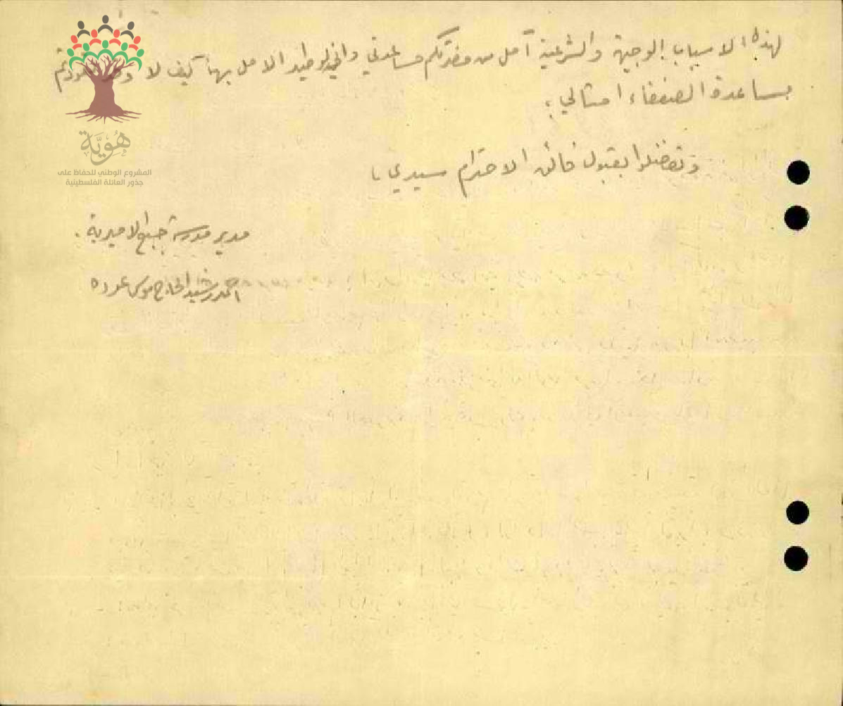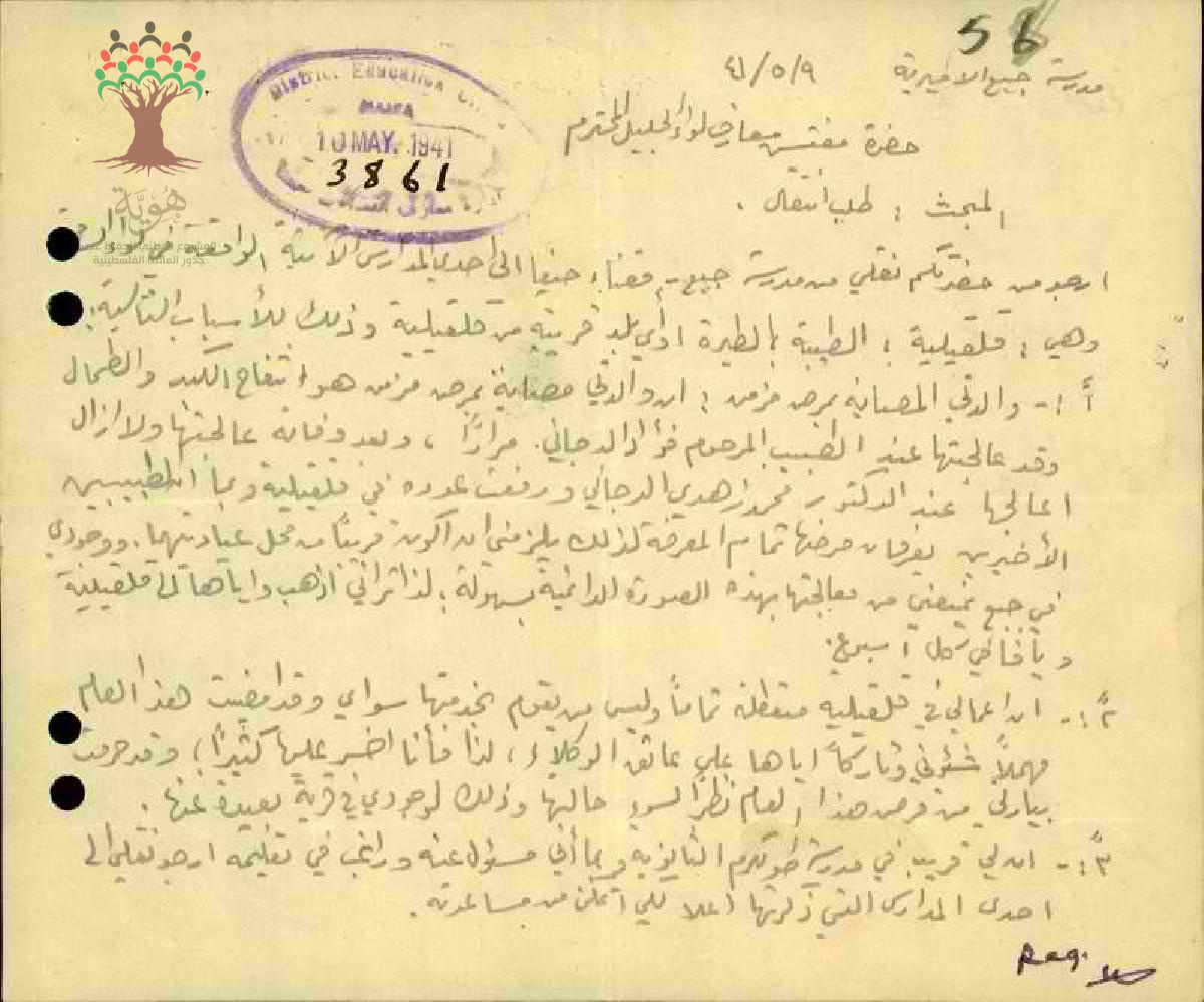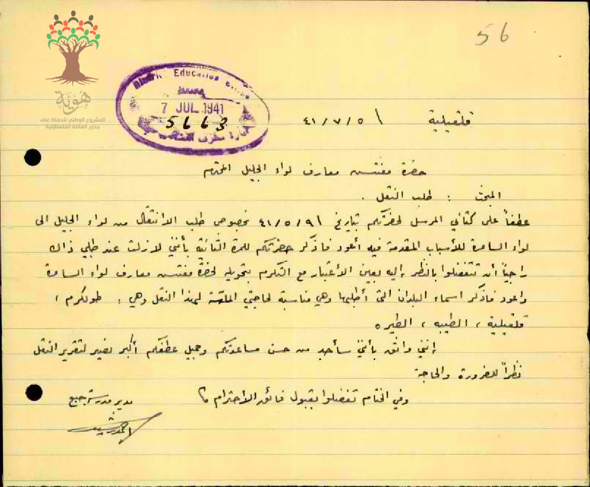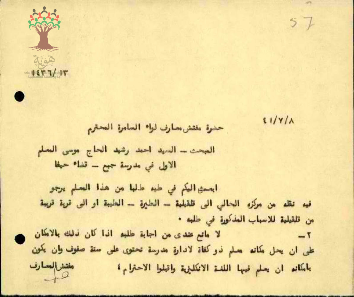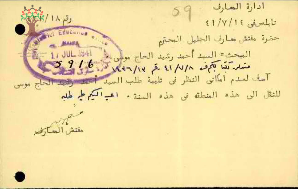 رسائل من مفتش المعارف إلى مفتش معارف الجليل يأسف عن عدم امكانه تلبية طلب المعلم أحمد رشيد موسى عودة بخصوص نقله