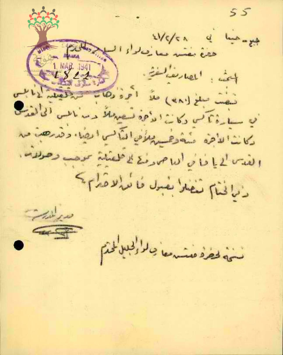 رسالة من المعلم أحمد رشيد موسى عودة إلى مفتش المعارف لواء السامرة تبحث مصاريف السفر