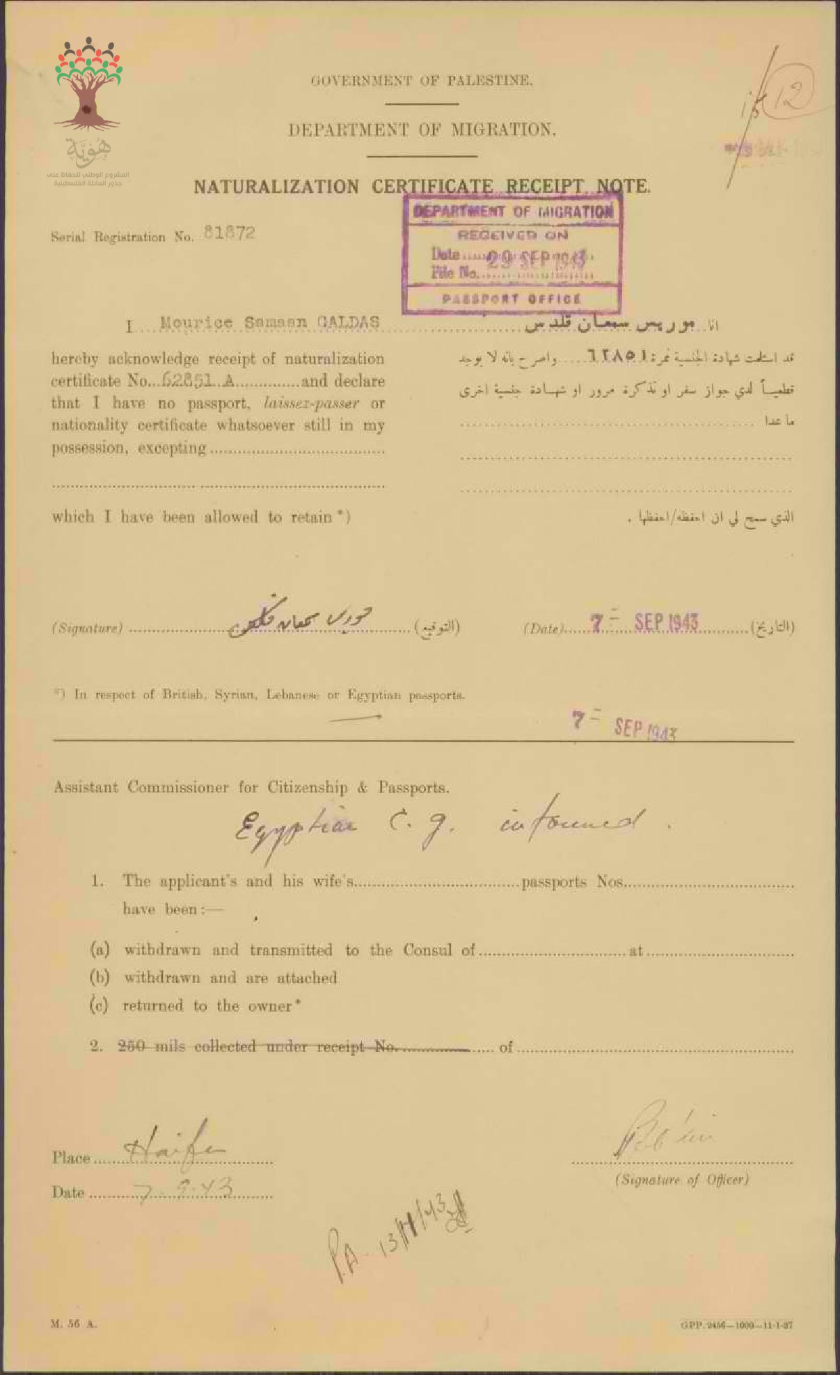 إيصال موقع من موريس سمعان قندس باستلام شهادة الجنسية الفلسطينية