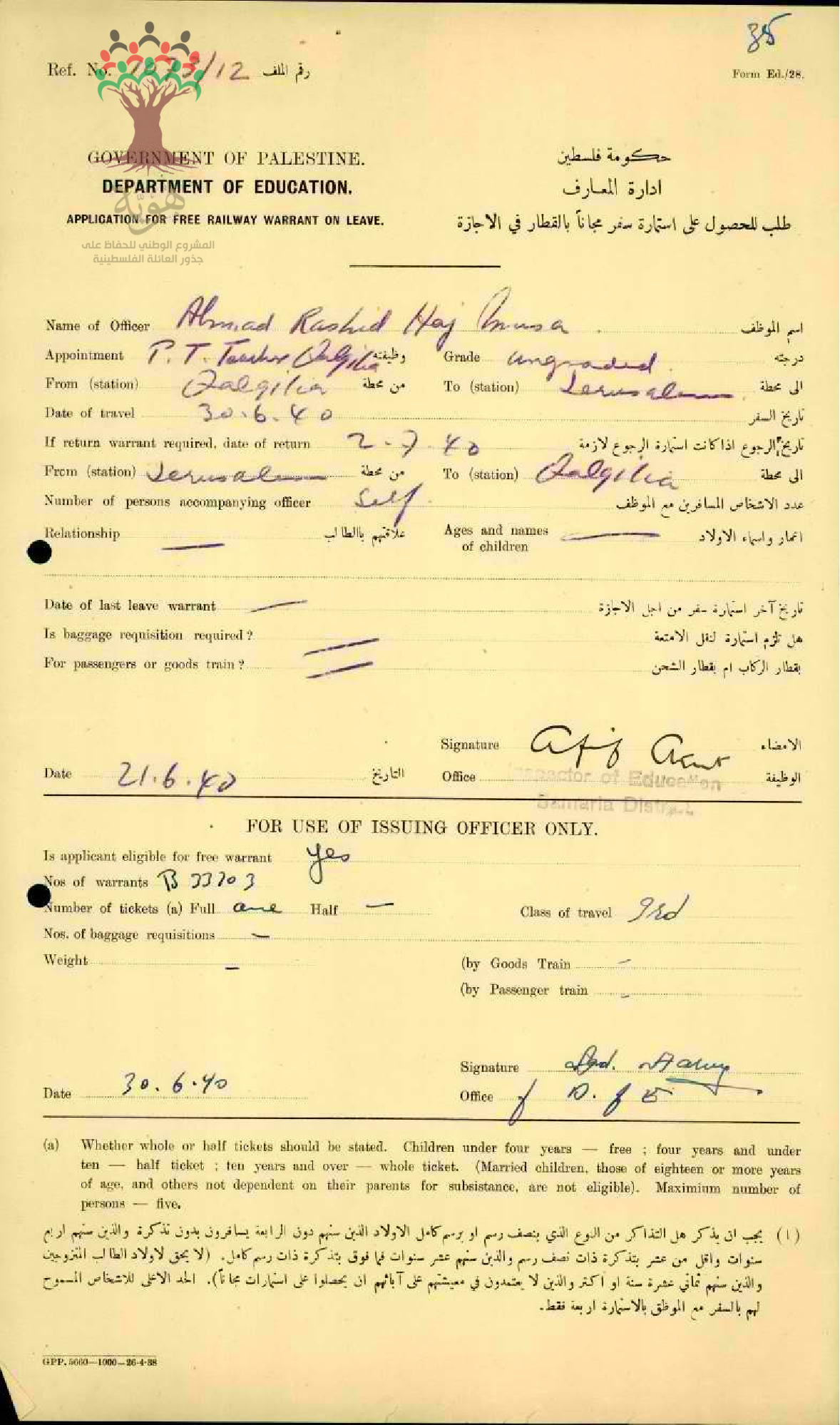 استمارة سفر مقدمة إلى المعلم أحمد رشيد موسى عودة /قلقيلية