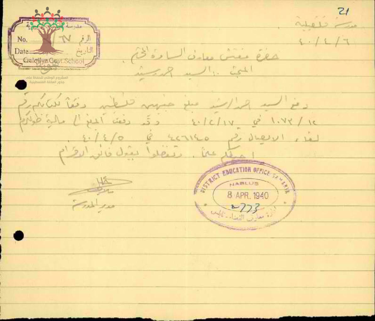 رسالة من مدير مدرسة قلقيلية إلى مفتش المعارف يخبره بأن المعلم أحمد رشيد موسى عودة قد دفع مبلغا إلى مالية طولكرم