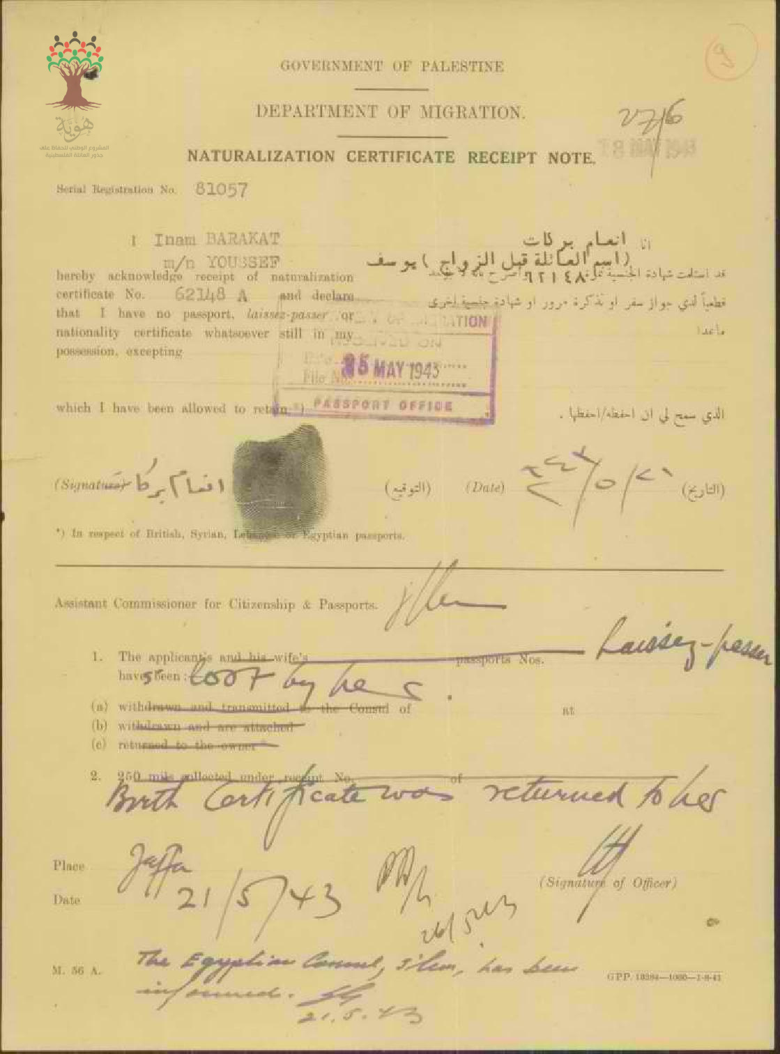 إيصال موقع من انعام يوسف بركات باستلام شهادة الجنسية الفلسطينية