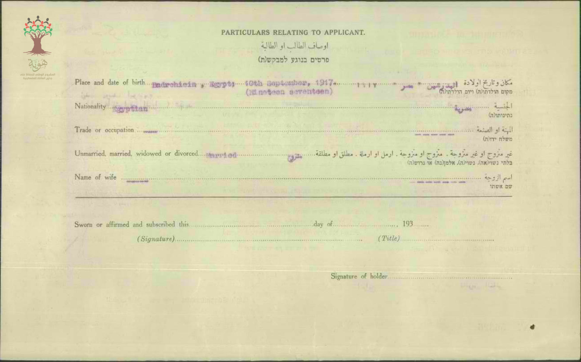 شهادة الجنسية الفلسطينية ل زينب شديد زوجة يوسف أبو دية