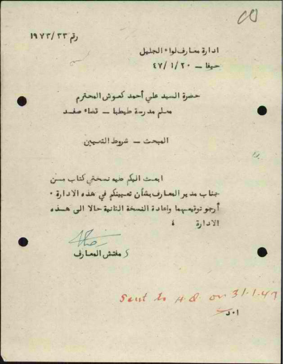 رسالة من مفتش المعارف إلى المعلم علي أحمد عبد كعوش تخبره بضرورة توقيع أوراق التعيين في مدرسة طيطبا