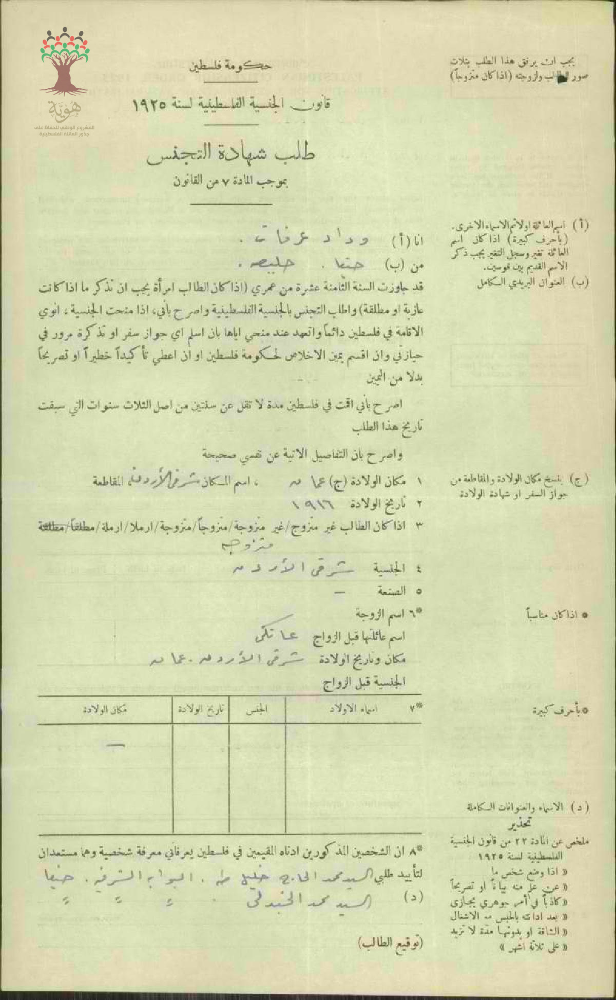 طلب الجنسية الفلسطينية-وداد عرفات-حيفا/الأردن