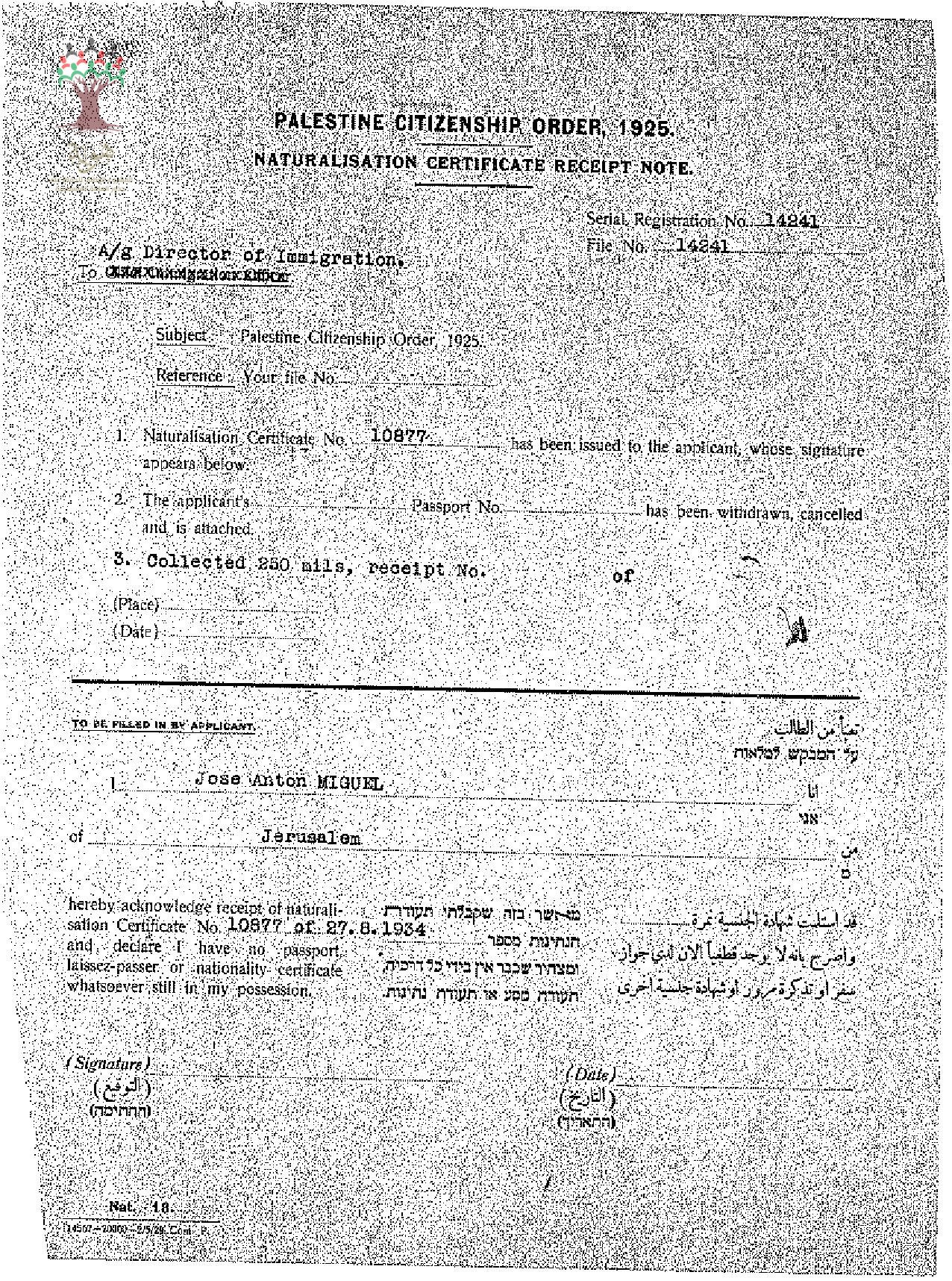 إيصال موقع من يوسف أنطون ميكيل باستلام شهادة الجنسية الفلسطينية