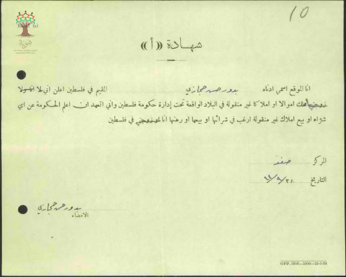 شهادة نفي ملكية -المعلمة بدور حجازي/صفد