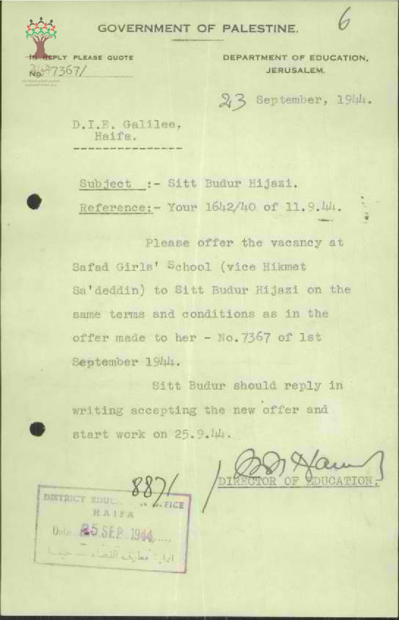 رسالة من مفتش المعارف إلى المعلمة بدور حجازي يخبرها بنقلها إلى مدرسة صفد للاناث بدلا من المعلمة حكمت سعد الدين