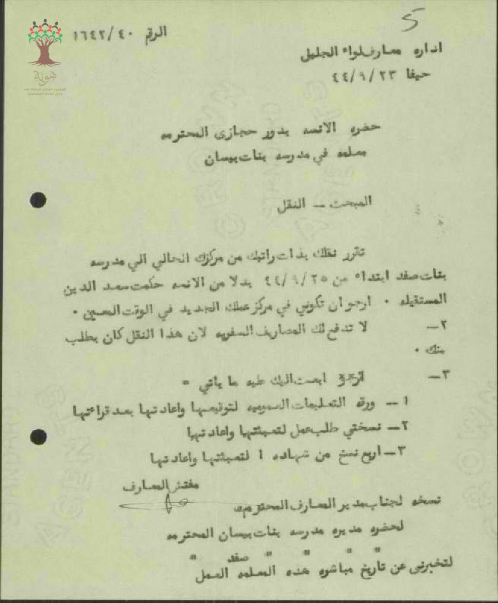 رسالة من مفتش المعارف إلى المعلمة بدور حجازي يخبرها بنقلها إلى مدرسة صفد للاناث