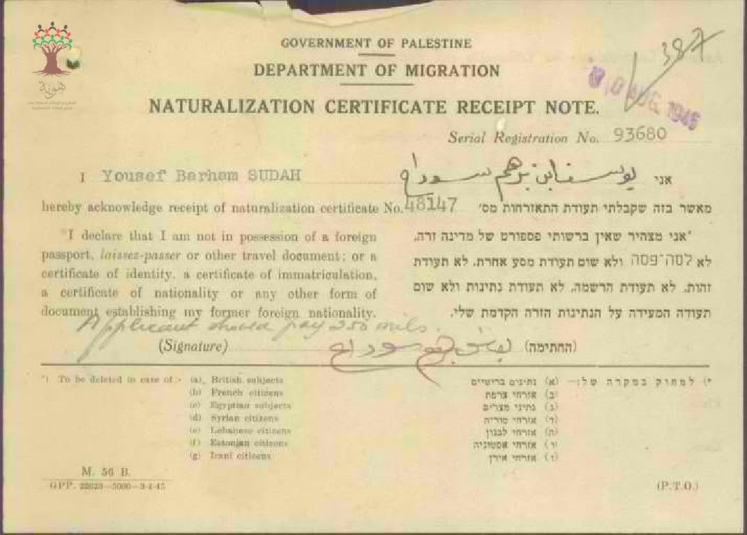 إيصال موقع من يوسف سوداح باستلام شهادة الجنسية الفلسطينية