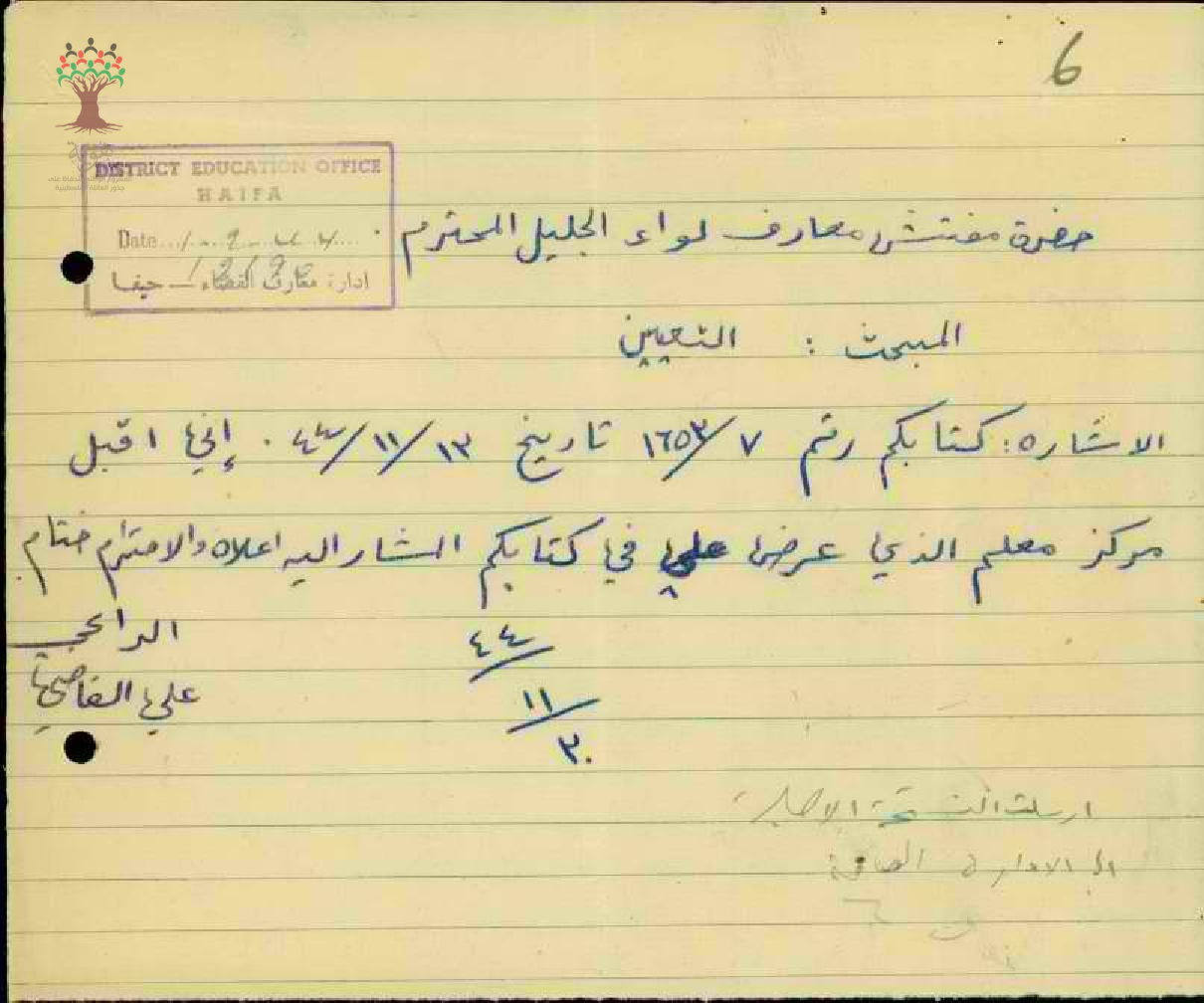 رسالة من المعلم علي القاضي إلى مفتش المعارف يخبره بموافقته على مركز معلم