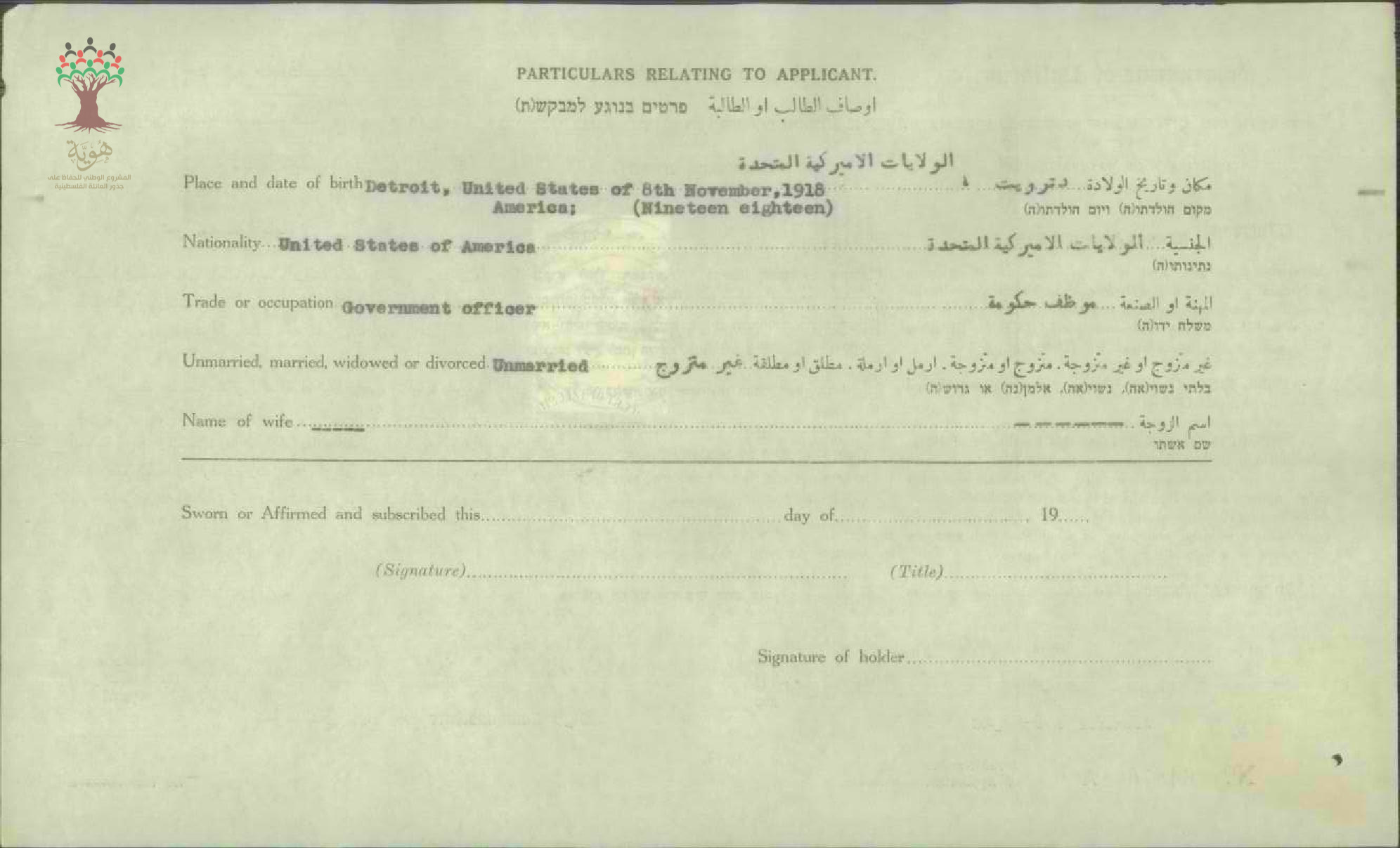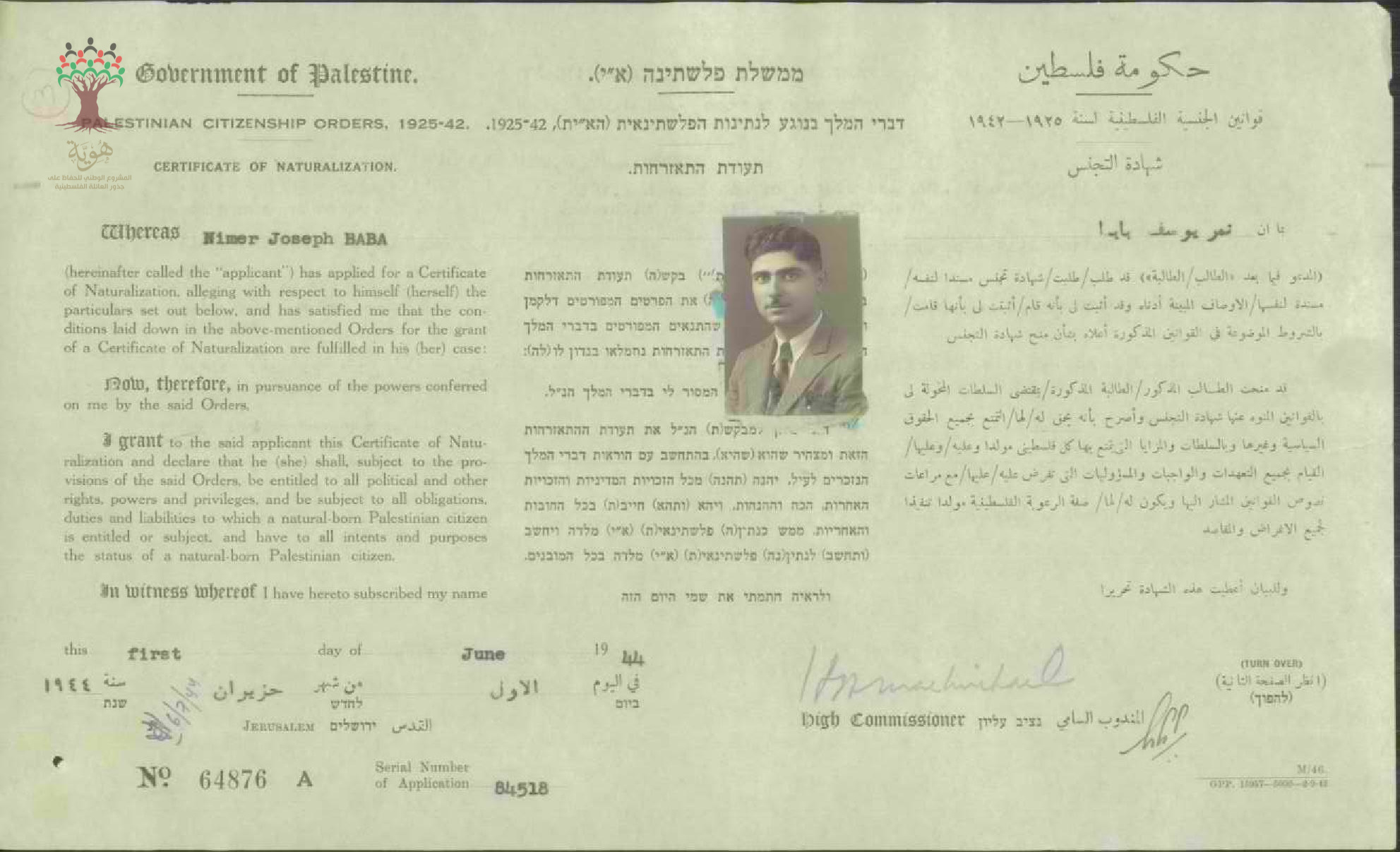 شهادة الجنسية الفلسطينية ل نمر يوسف البابا
