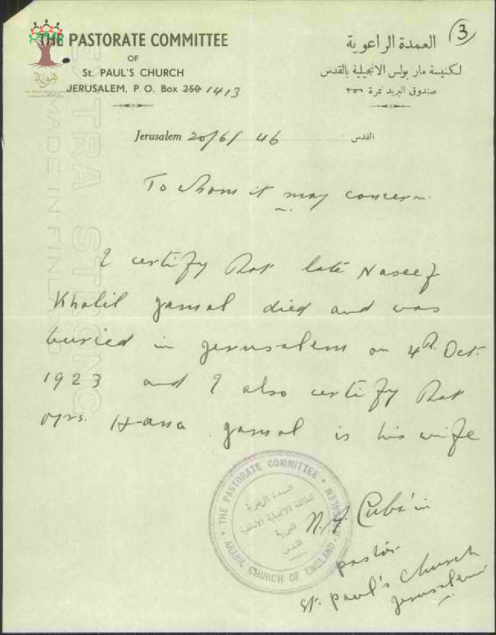 شهادة من الرئيس الروحي للطائفة الإنجيلية نجيب بالقدس للسيدة هنا جمل بأنها زوجة المرحوم ناصيف خليل الجمل